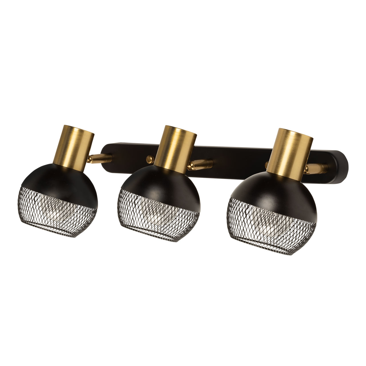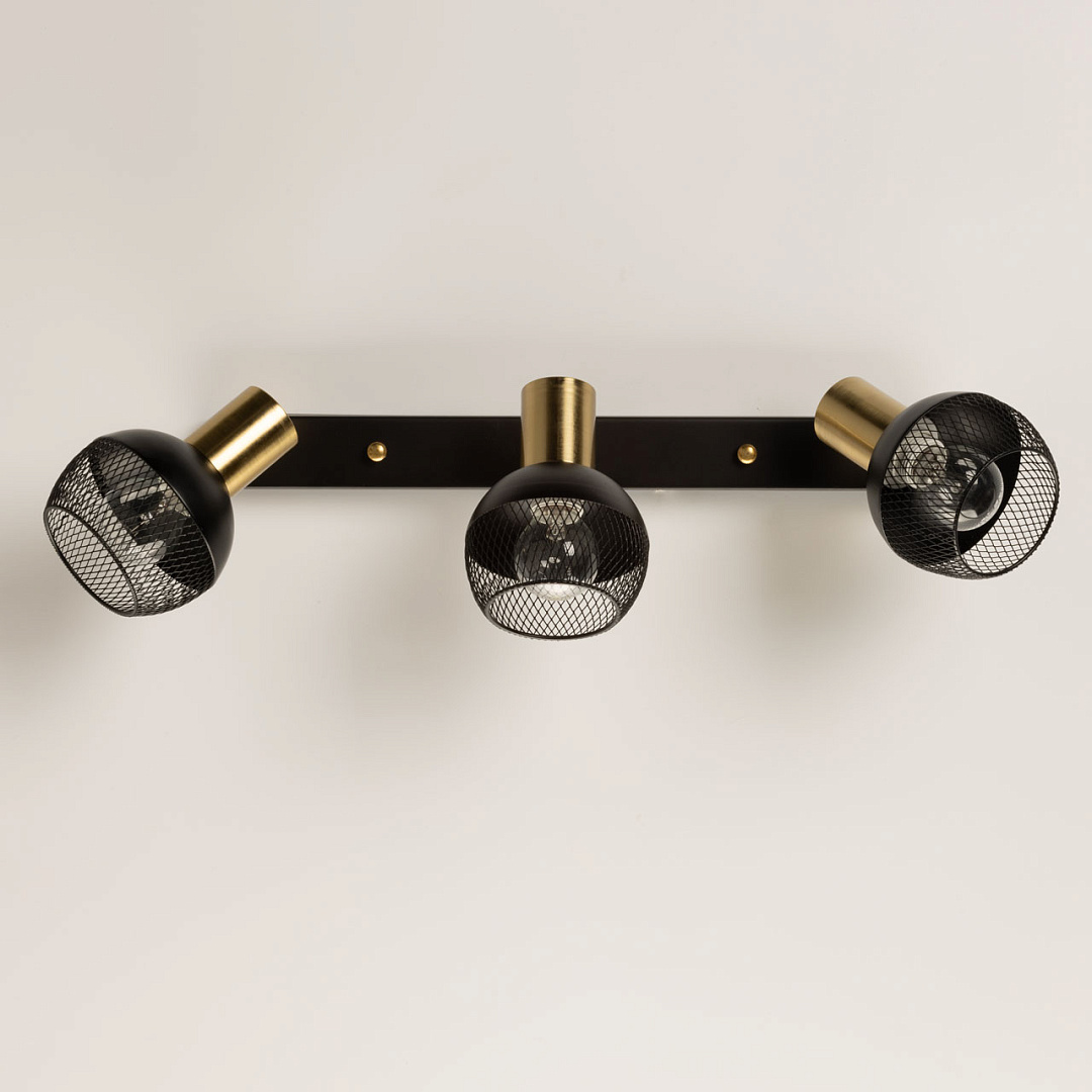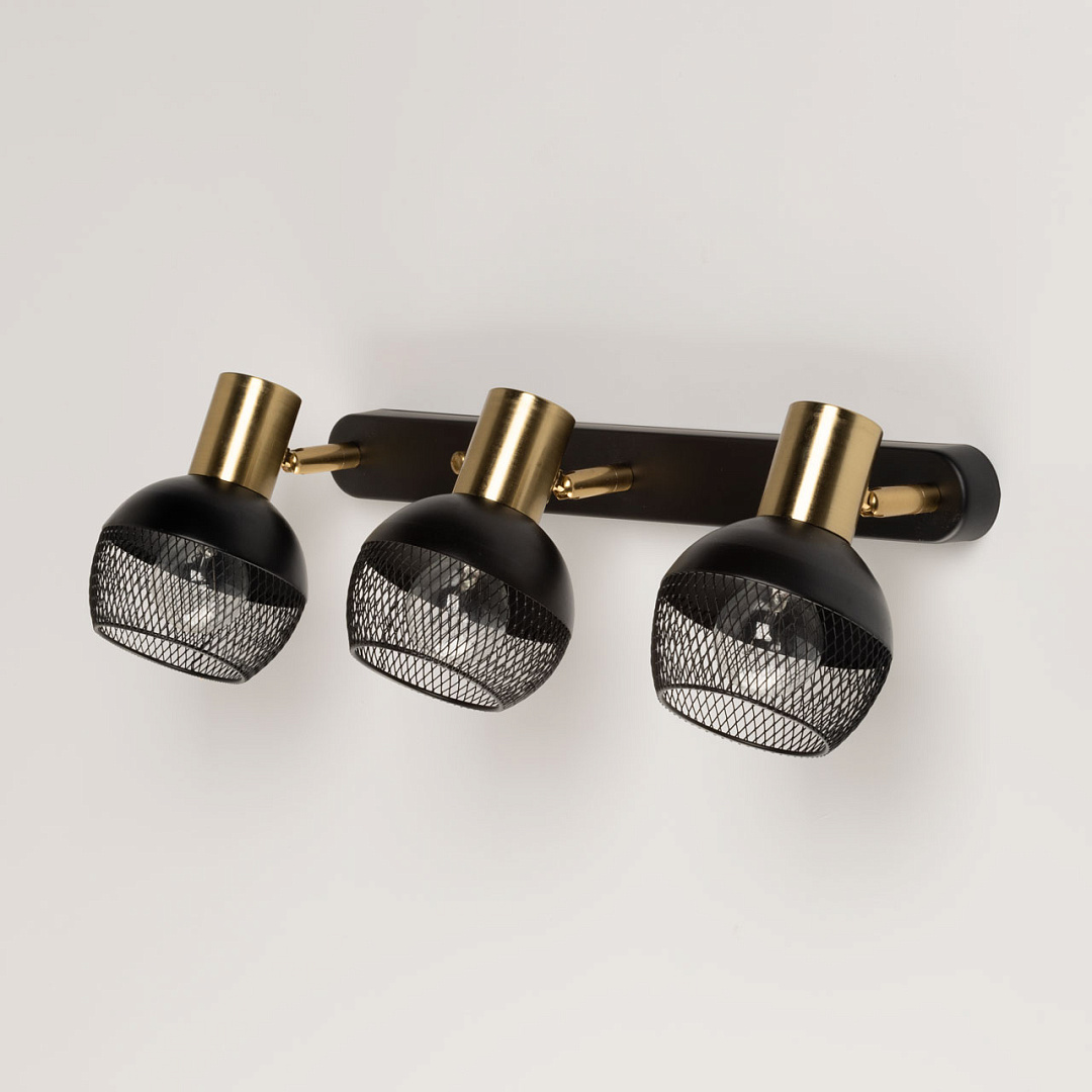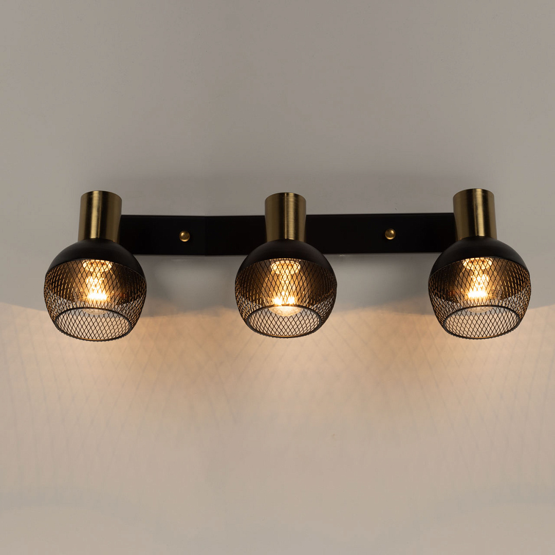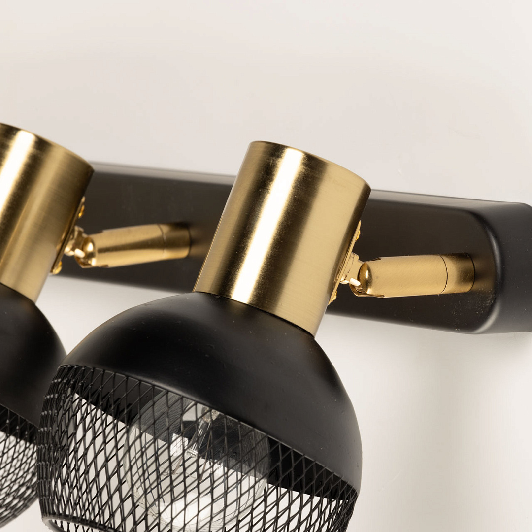 Контрастное сочетание черного цвета и цвета латуни делает настенное бра ярким акцентом в интерьере. Сетчатый узор плафонов формирует эффектный световой рисунок. Поворотный плафон  с креплением на шарнире позволяет направлять световой поток в нужную сторону, что создает комфортное освещение. Заменяемые источники света удобны в эксплуатации.
