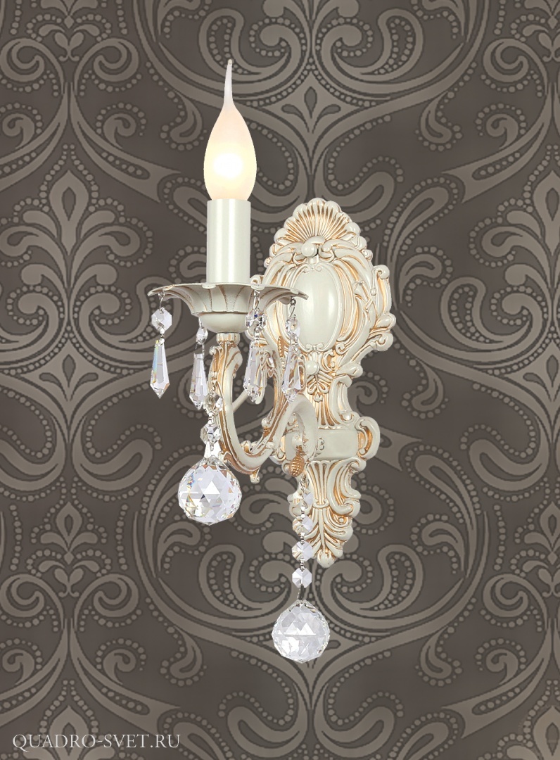 Настенный светильник 1308-1W производства Favourite (Германия) из коллекции Gesso выполнен в стиле классика. Арматура светильника выполнена из металла белого цвета с золочением. Поверхность арматуры глянцевая, рельефная. Плафон отсутствует. Декоративные элементы выполнены из хрусталя.Осветительный прибор рассчитан на освещение пространства площадью 2 кв. м. Тип цоколя используемых ламп E14. Производитель рекомендует использовать лампы мощностью не более 40 Вт. Суммарная мощность светильника составляет 40 Вт. Лампочки в комплект не входят. Защита от попадания влаги и пыли внутрь изделия не предусмотрена. Рекомендуем к применению в гостиной, кабинете, спальне.
