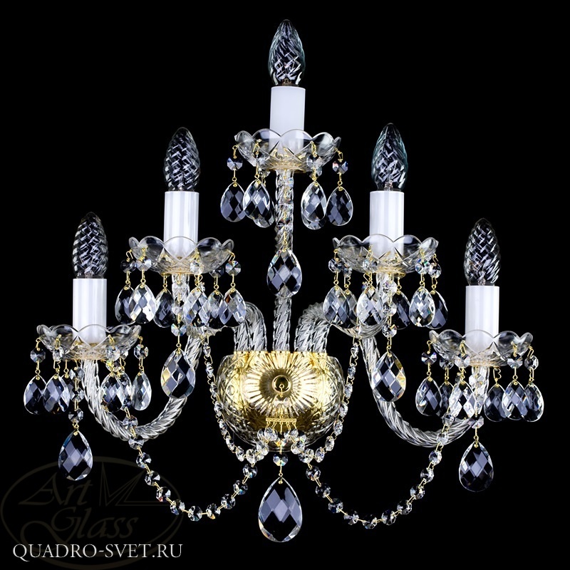 Хрустальное бра размерами 46 х 43 см с 5 лампочками и хрустальными подвесками Classic, Crystal Exclusive или Swarovski Spectra. Хрустальные и стеклянные элементы вместе с мягко блестящими металлическими деталями гарантируют высокий блеск этого изделия. Бра подходит к всем типам интерьеров - классическим и современным, и прекрасно комбинируется с другими, не только потолочными светильниками.
