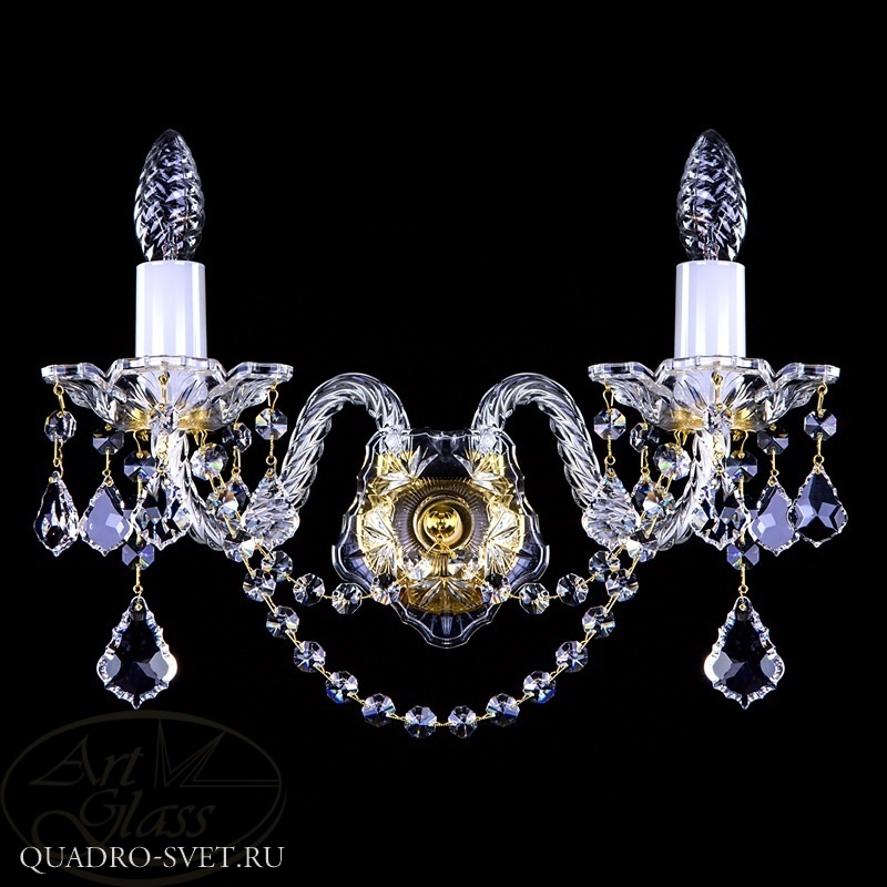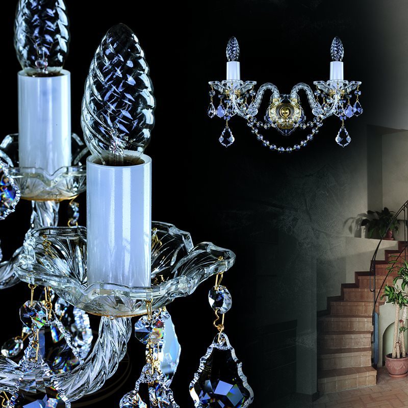 Хрустальное бра размерами 34 х 25 см с 2 лампочками и хрустальными подвесками Classic, Crystal Exclusive или Swarovski Spectra. Хрустальные и стеклянные элементы вместе с мягко блестящими металлическими деталями гарантируют высокий блеск этого изделия. Бра подходит к всем типам интерьеров - классическим и современным, и прекрасно комбинируется с другими, не только потолочными светильниками.