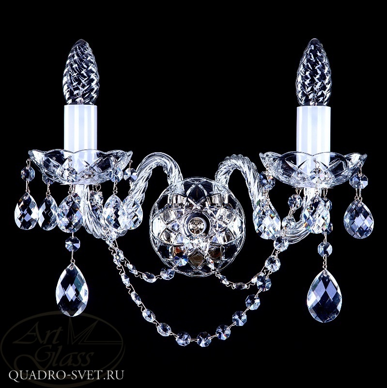 Хрустальное бра размерами 34 х 25 см с 2 лампочками и хрустальными подвесками Crystal Exclusive или Swarovski Spectra. Хрустальные и стеклянные элементы вместе с мягко блестящими металлическими деталями гарантируют высокий блеск этого изделия. Бра подходит к всем типам интерьеров - классическим и современным, и прекрасно комбинируется с другими, не только потолочными светильниками.