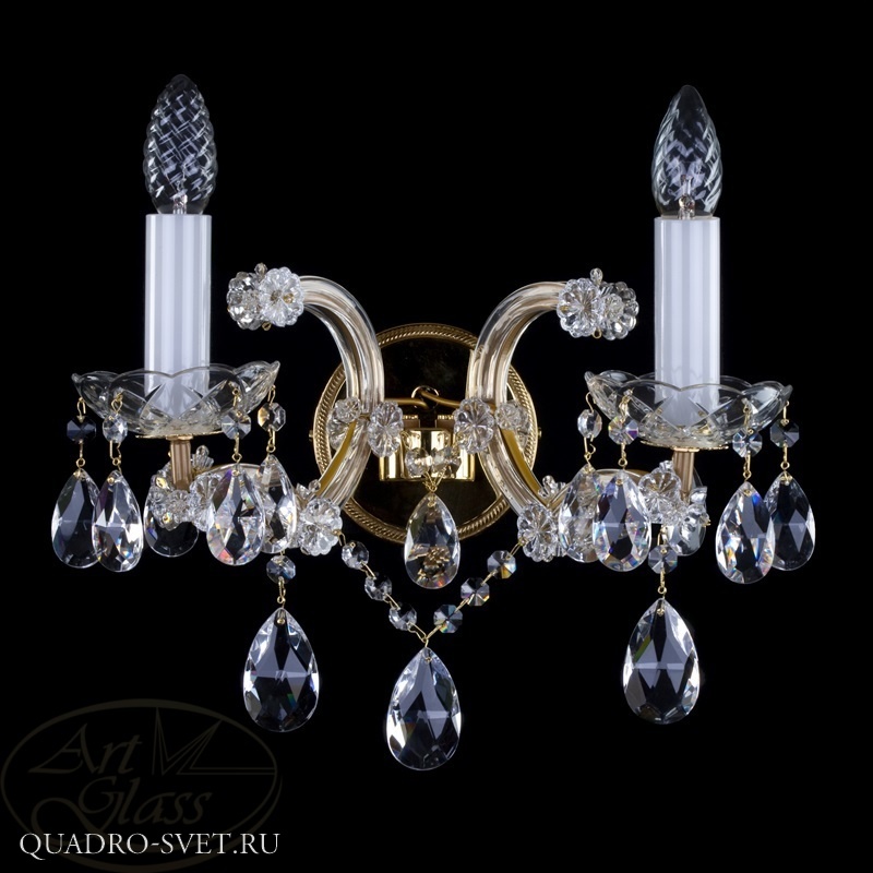 Хрустальное бра Мариа Терезия размерами 36 х 33 см с 2 лампочками и хрустальными подвесками Classic, Crystal Exclusive или Swarovski Spectra. Хрустальные и стеклянные элементы вместе с мягко блестящими металлическими деталями гарантируют высокий блеск этого терезиянского изделия. Бра Мариа Терезия подходит к всем типам интерьеров - классическим и современным, и прекрасно комбинируется с другими типами освещений - потолочными или настольными.
