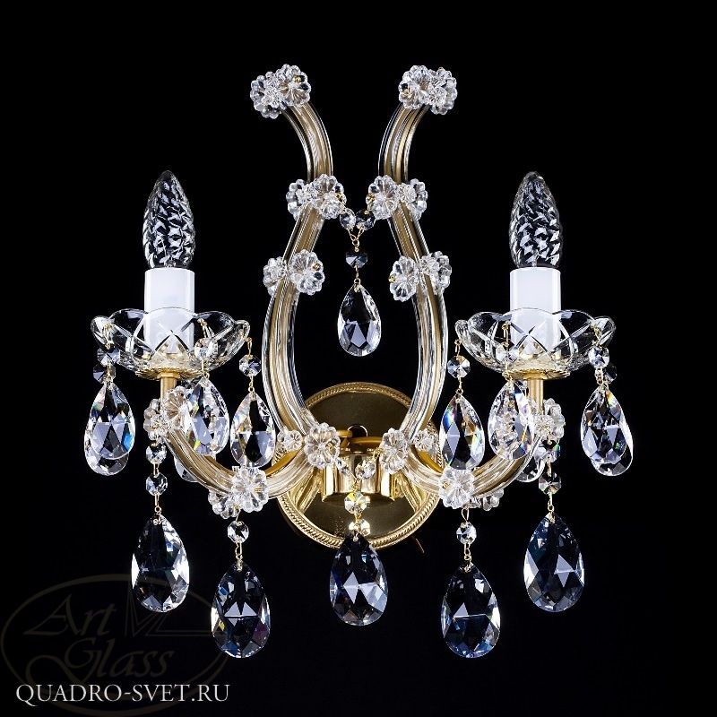 Хрустальное бра Мариа Терезия размерами 35 х 40 см с 2 лампочками и хрустальными подвесками Classic, Crystal Exclusive или Swarovski Spectra. Хрустальные и стеклянные элементы вместе с мягко блестящими металлическими деталями гарантируют высокий блеск этого терезиянского изделия. Бра Мариа Терезия подходит к всем типам интерьеров - классическим и современным, и прекрасно комбинируется с другими типами освещений - потолочными или настольными.