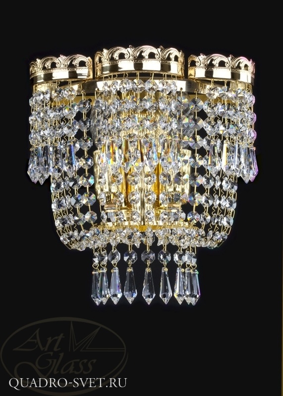 Хрустальное бра в форме корзины, размерами 24 x 35 см, с 2 лампочками и подвесками Crystal Exclusive или Swarovski Spectra. Хрустальные элементы вместе с мягко блестящими металлическими деталями гарантируют высокий блеск этого изделия. Бра подходит к всем типам интерьеров - классическим и современным, и прекрасно комбинируется с другими типами освещения - например с потолочными хрустальными светильниками.