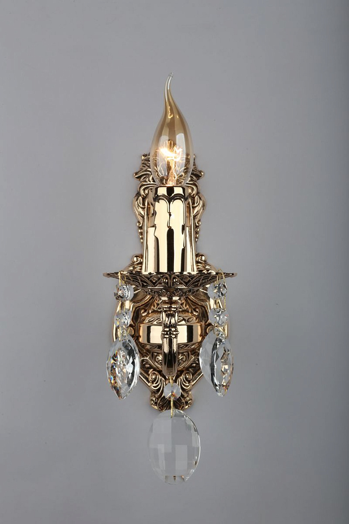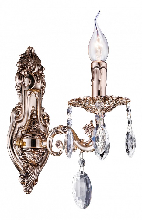 металла золотого цвета. Поверхность арматуры глянцевая и рельефная. Плафон отсутствует. Осветительный прибор рассчитан на освещение пространства площадью 2 кв. м. Тип цоколя используемых ламп E14. Производитель рекомендует использовать лампы мощностью не более 40 Вт. Суммарная мощность светильника составляет 40 Вт. Лампочки в комплект не входят. Защита от попадания влаги и пыли внутрь изделия не предусмотрена. Рекомендуем к применению в гостиной, кабинете, спальне.
