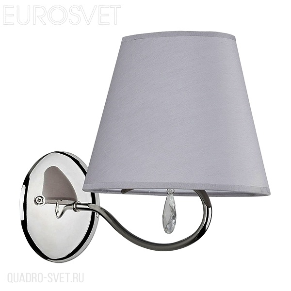 металла цвета хром. Поверхность арматуры глянцевая. Плафон изготовлен из текстиля серого цвета. Декоративные элементы выполнены из хрусталя. Осветительный прибор рассчитан на освещение пространства площадью 2 кв. м. Тип цоколя используемых ламп E14. Производитель рекомендует использовать лампы мощностью не более 40 Вт. Суммарная мощность светильника составляет 40 Вт. Лампочки в комплект не входят. Защита от попадания влаги и пыли внутрь изделия не предусмотрена. Рекомендуем к применению в гостиной, спальне, прихожей, коридоре.