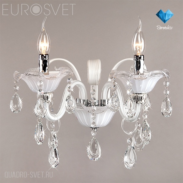 металла и стекла белого и хромового цветов. Поверхность арматуры глянцево-матовая. Плафон отсутствует. Декоративные элементы выполнены из хрусталя. Осветительный прибор рассчитан на освещение пространства площадью 10 кв. м. Тип цоколя используемых ламп E14. Производитель рекомендует использовать лампы мощностью не более 60 Вт. Суммарная мощность светильника составляет 120 Вт. Лампочки в комплект не входят. Защита от попадания влаги и пыли внутрь изделия не предусмотрена. Рекомендуем к применению в гостиной, кабинете, спальне.