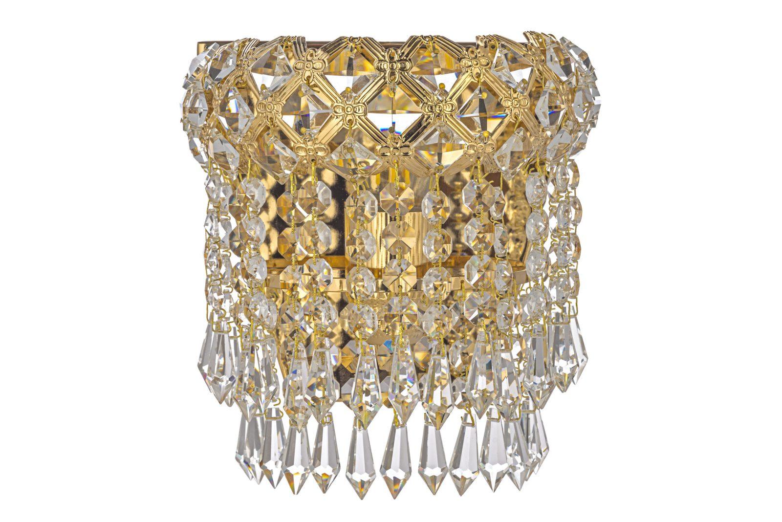 латуни золотого цвета. Поверхность арматуры матовая. Плафон изготовлен из хрусталя прозрачного цвета, имеет форму полусферы и матовую поверхность. Направлен вниз. Декоративные элементы выполнены из прозрачного хрусталя. Осветительный прибор рассчитан на освещение пространства площадью 3 кв. м. Тип цоколя используемых ламп E27. Производитель рекомендует использовать лампы мощностью не более 60 Вт. Суммарная мощность светильника составляет 60 Вт. Лампочки в комплект не входят. Защита от попадания влаги и пыли внутрь изделия не предусмотрена. Рекомендуем к применению в гостиной, кабинете, прихожей, спальне.