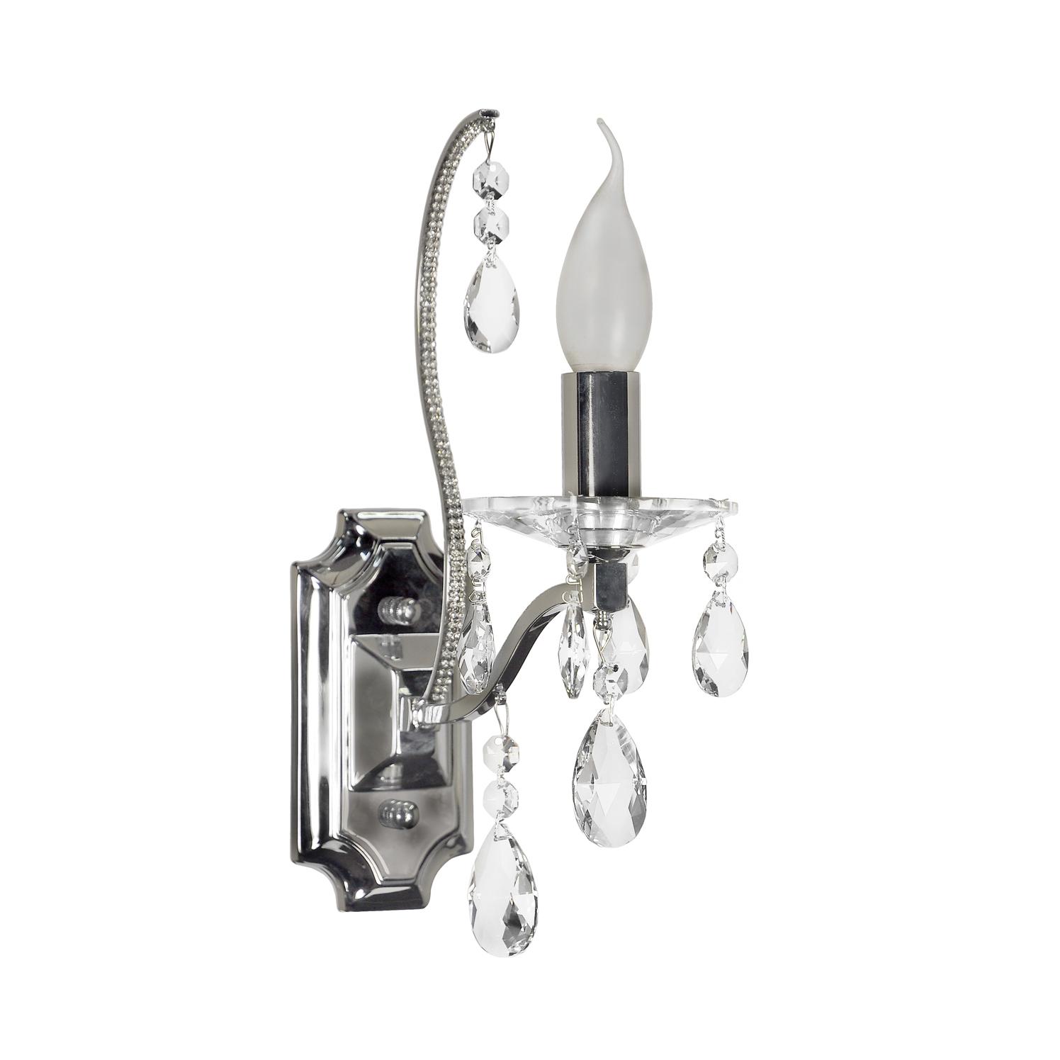 металла цвета никель. Поверхность арматуры глянцевая. Плафон отсутствует. Декоративные элементы выполнены из прозрачного хрусталя. Осветительный прибор рассчитан на освещение пространства площадью 2 кв. м. Тип цоколя используемых ламп E14. Производитель рекомендует использовать лампы мощностью не более 40 Вт. Суммарная мощность светильника составляет 40 Вт. Лампочки в комплект не входят. Защита от попадания влаги и пыли внутрь изделия не предусмотрена. Рекомендуем к применению в гостиной, кабинете, спальне.
