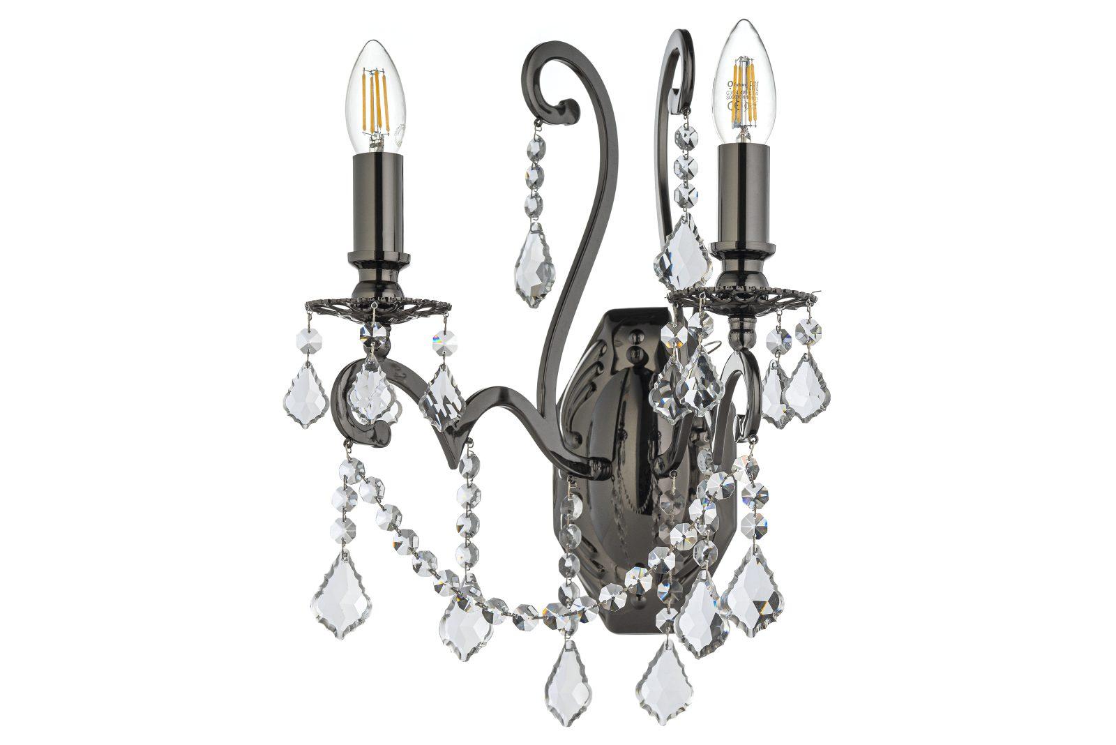 металла цвета никель с чернением. Поверхность арматуры матовая. Плафон отсутствует. Декоративные элементы выполнены из прозрачного хрусталя. Осветительный прибор рассчитан на освещение пространства площадью 4 кв. м. Тип цоколя используемых ламп E14. Производитель рекомендует использовать лампы мощностью не более 40 Вт. Суммарная мощность светильника составляет 80 Вт. Лампочки в комплект не входят. Защита от попадания влаги и пыли внутрь изделия не предусмотрена. Рекомендуем к применению в гостиной, кабинете, спальне.