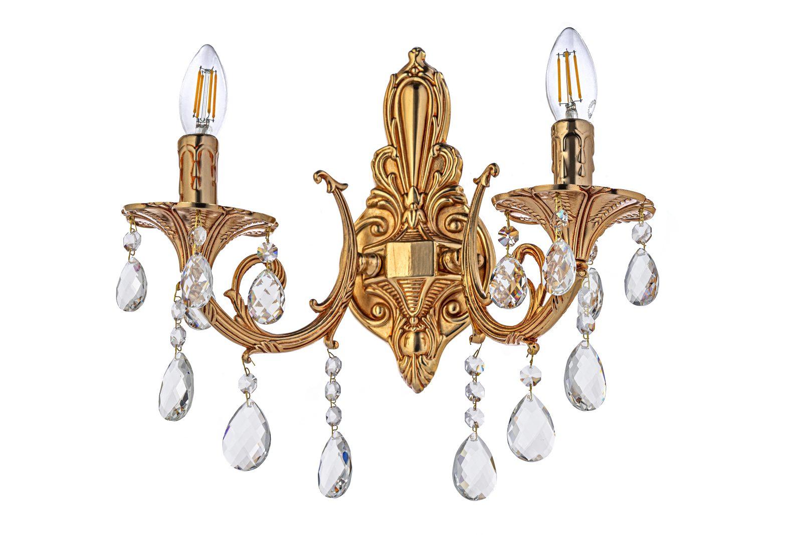 металла золотого цвета с чернением. Поверхность арматуры глянцевая и рельефная. Плафон отсутствует. Декоративные элементы выполнены из прозрачного хрусталя. Осветительный прибор рассчитан на освещение пространства площадью 4 кв. м. Тип цоколя используемых ламп E14. Производитель рекомендует использовать лампы мощностью не более 40 Вт. Суммарная мощность светильника составляет 80 Вт. Лампочки в комплект не входят. Защита от попадания влаги и пыли внутрь изделия не предусмотрена. Рекомендуем к применению в гостиной, кабинете, спальне.
