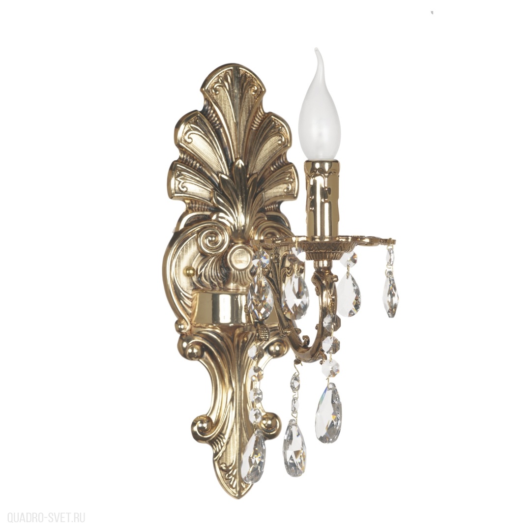 металла золотого цвета с чернением. Поверхность арматуры глянцевая и рельефная. Плафон отсутствует. Декоративные элементы выполнены из прозрачного хрусталя. Осветительный прибор рассчитан на освещение пространства площадью 2 кв. м. Тип цоколя используемых ламп E14. Производитель рекомендует использовать лампы мощностью не более 40 Вт. Суммарная мощность светильника составляет 40 Вт. Лампочки в комплект не входят. Защита от попадания влаги и пыли внутрь изделия не предусмотрена. Рекомендуем к применению в гостиной, спальне, прихожей, коридоре.