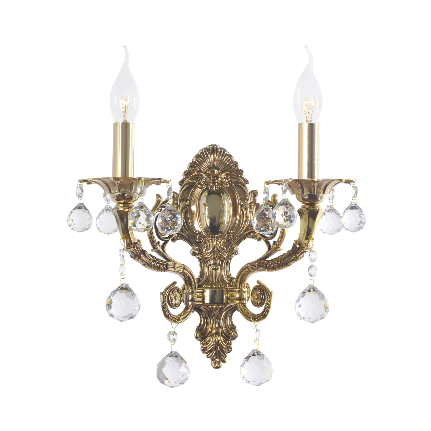 металла золотого цвета с чернением. Поверхность арматуры глянцевая. Плафон отсутствует. Декоративные элементы выполнены из прозрачного хрусталя. Осветительный прибор рассчитан на освещение пространства площадью 4 кв. м. Тип цоколя используемых ламп E14. Производитель рекомендует использовать лампы мощностью не более 40 Вт. Суммарная мощность светильника составляет 80 Вт. Лампочки в комплект не входят. Защита от попадания влаги и пыли внутрь изделия не предусмотрена. Рекомендуем к применению в гостиной, спальне, прихожей, коридоре.