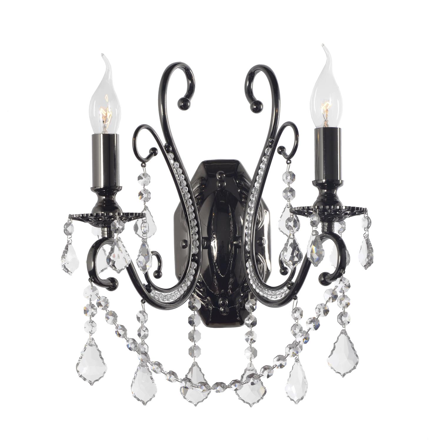 металла цвета никель с чернением. Поверхность арматуры глянцевая. Плафон отсутствует. Декоративные элементы выполнены из прозрачного хрусталя. Осветительный прибор рассчитан на освещение пространства площадью 4 кв. м. Тип цоколя используемых ламп E14. Производитель рекомендует использовать лампы мощностью не более 40 Вт. Суммарная мощность светильника составляет 80 Вт. Лампочки в комплект не входят. Защита от попадания влаги и пыли внутрь изделия не предусмотрена. Рекомендуем к применению в гостиной, кабинете, спальне.