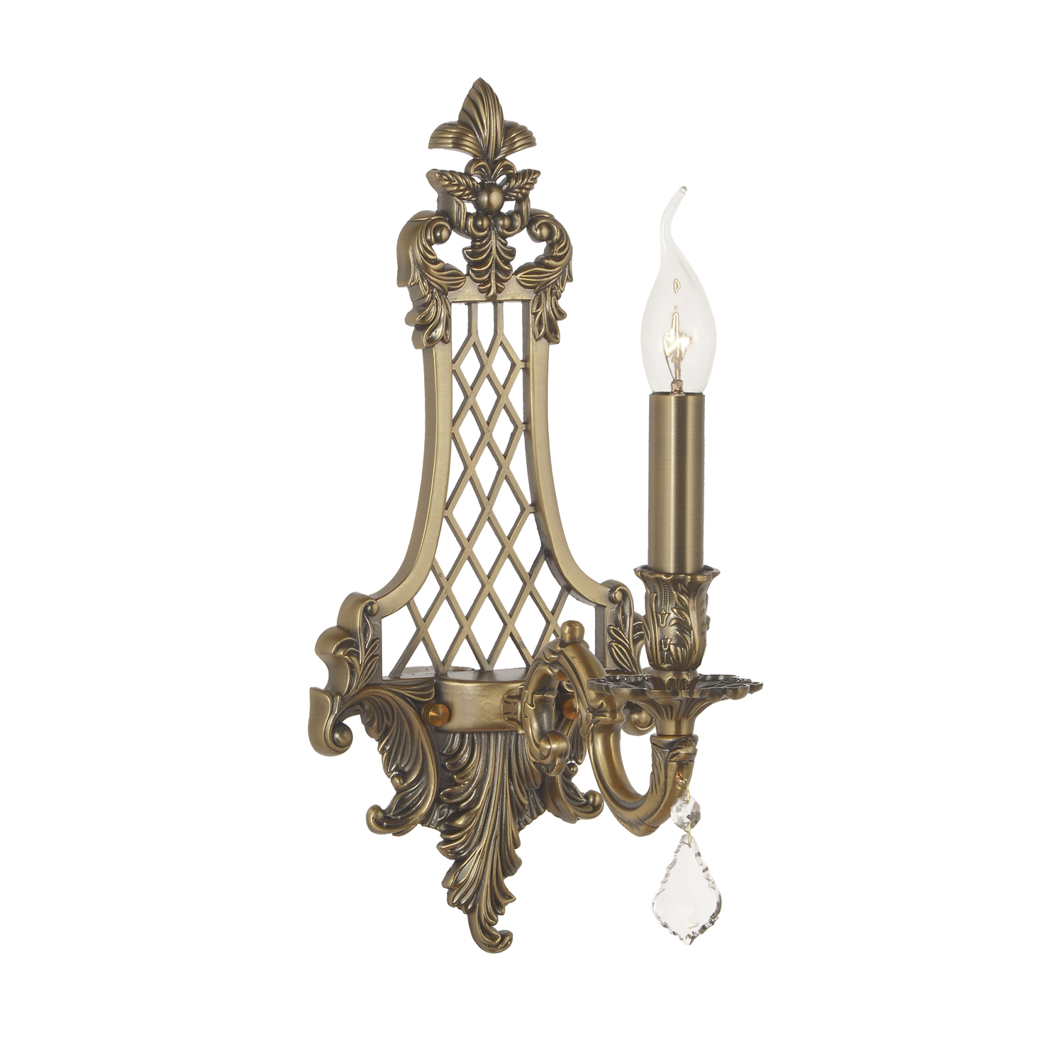 металла цвета античное золото. Поверхность арматуры глянцевая. Плафон отсутствует. Декоративные элементы выполнены из прозрачного хрусталя. Осветительный прибор рассчитан на освещение пространства площадью 2 кв. м. Тип цоколя используемых ламп E14. Производитель рекомендует использовать лампы мощностью не более 40 Вт. Суммарная мощность светильника составляет 40 Вт. Лампочки в комплект не входят. Защита от попадания влаги и пыли внутрь изделия не предусмотрена. Рекомендуем к применению в гостиной, спальне, прихожей, коридоре.