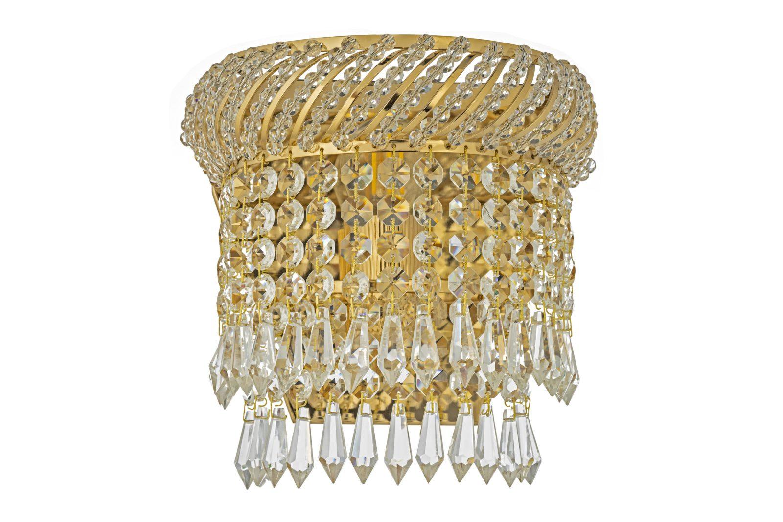 металла золотого цвета. Поверхность арматуры глянцевая. Плафон изготовлен из хрусталя прозрачного цвета. с глянцевой поверхностью. Декоративные элементы выполнены из прозрачного хрусталя. Осветительный прибор рассчитан на освещение пространства площадью 3 кв. м. Тип цоколя используемых ламп E27. Производитель рекомендует использовать лампы мощностью не более 60 Вт. Суммарная мощность светильника составляет 60 Вт. Лампочки в комплект не входят. Защита от попадания влаги и пыли внутрь изделия не предусмотрена. Рекомендуем к применению в гостиной, кабинете, прихожей, спальне.