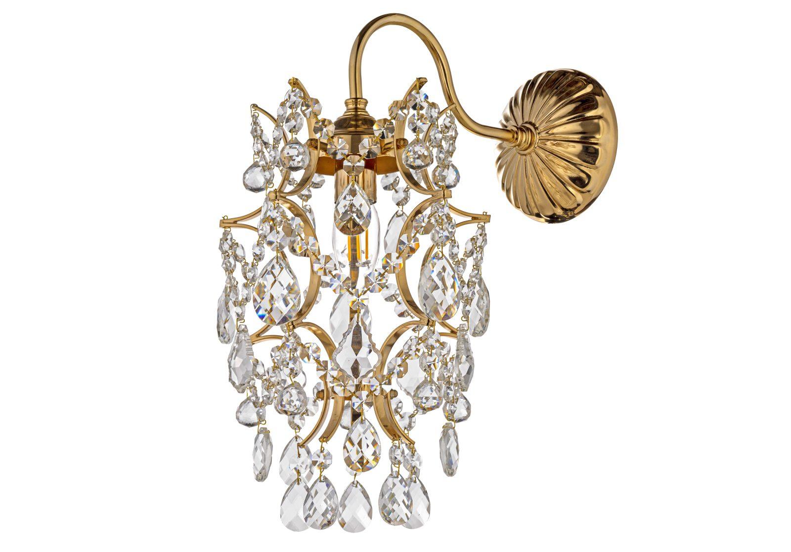 металла золотого цвета. Поверхность арматуры глянцевая. Плафон изготовлен из хрусталя прозрачного цвета. с глянцевой поверхностью. Декоративные элементы выполнены из прозрачного хрусталя. Осветительный прибор рассчитан на освещение пространства площадью 2 кв. м. Тип цоколя используемых ламп E14. Производитель рекомендует использовать лампы мощностью не более 40 Вт. Суммарная мощность светильника составляет 40 Вт. Лампочки в комплект не входят. Защита от попадания влаги и пыли внутрь изделия не предусмотрена. Рекомендуем к применению в гостиной, кабинете, спальне.