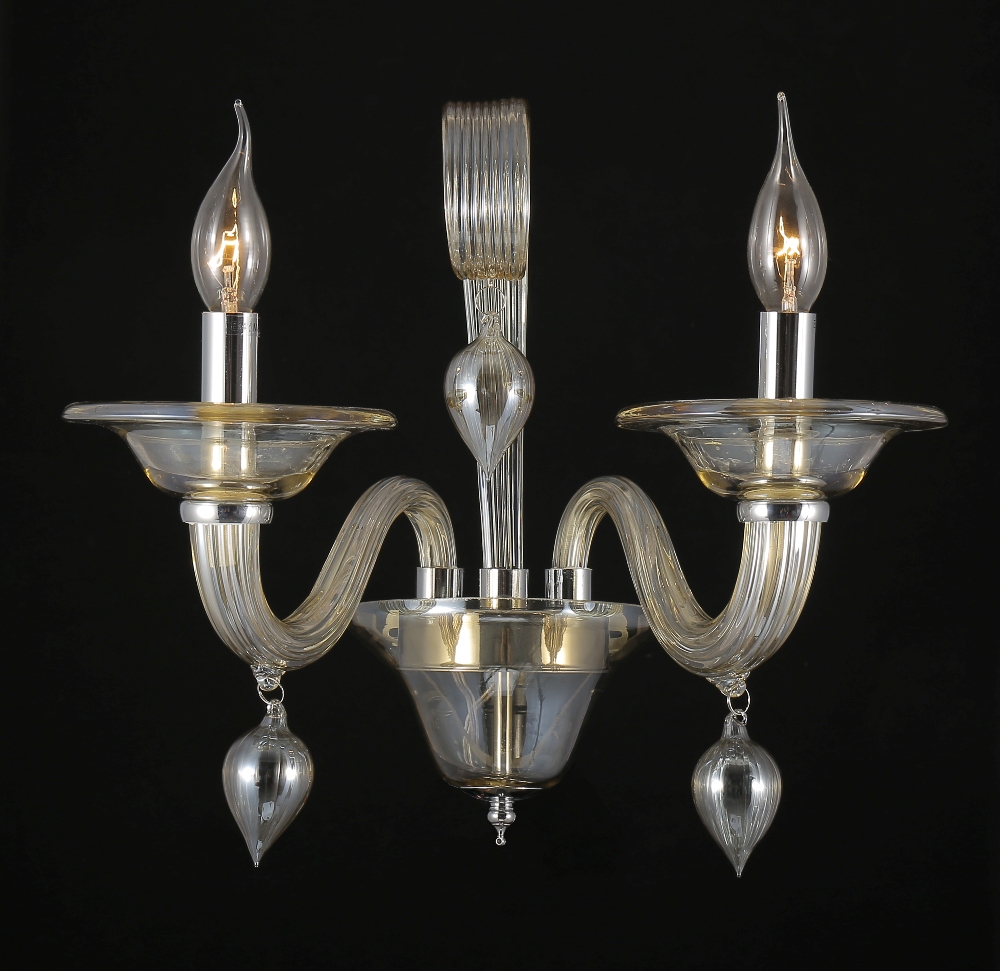 металла и стекла светло-коньячного и хромового цветов. Поверхность арматуры глянцевая. Плафон отсутствует. Декоративные элементы выполнены из стекла светло-коньячного цвета. Осветительный прибор рассчитан на освещение пространства площадью 6 кв. м. Тип цоколя используемых ламп E14. Производитель рекомендует использовать лампы мощностью не более 60 Вт. Суммарная мощность светильника составляет 120 Вт. Лампочки в комплект не входят. Защита от попадания влаги и пыли внутрь изделия не предусмотрена. Рекомендуем к применению в гостиной, спальне, прихожей, коридоре.