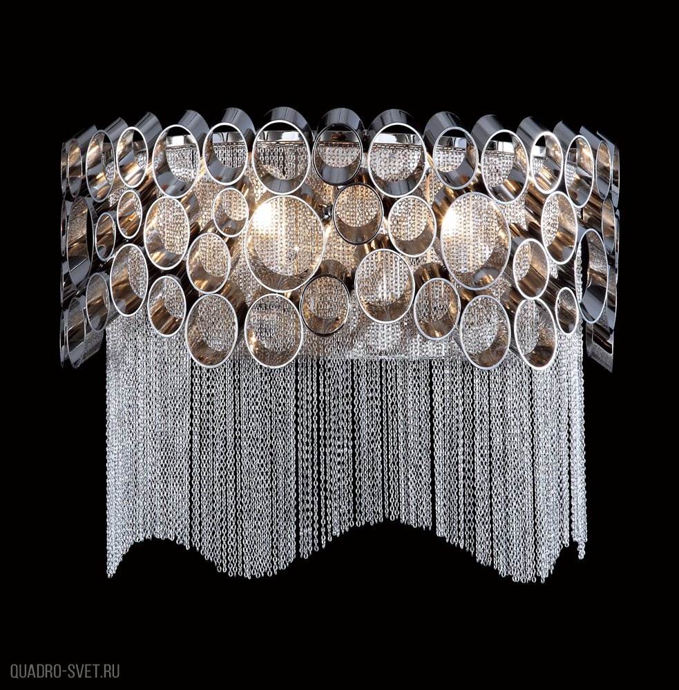 металла цвета никель. Поверхность арматуры глянцевая. Плафон изготовлен из металла цвета никель. Декоративные элементы выполнены из металлической цепочки. Осветительный прибор рассчитан на освещение пространства площадью 6 кв. м. Тип цоколя используемых ламп E27. Производитель рекомендует использовать лампы мощностью не более 60 Вт. Суммарная мощность светильника составляет 120 Вт. Лампочки в комплект не входят. Защита от попадания влаги и пыли внутрь изделия не предусмотрена. Рекомендуем к применению в гостиной, спальне, прихожей, коридоре.