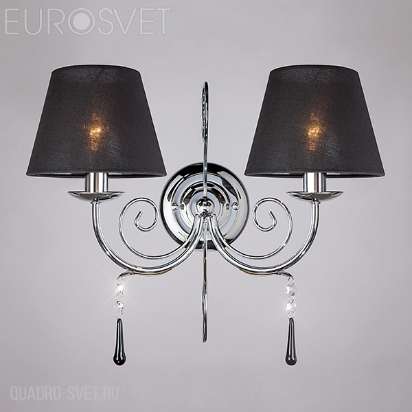 металла цвета хром. Поверхность арматуры матовая. Плафон изготовлен из текстиля черного цвета, имеет конусную форму и матовую поверхность. Направлен вверх и вниз. Декоративные элементы выполнены из черного хрусталя. Осветительный прибор рассчитан на освещение пространства площадью 6 кв. м. Тип цоколя используемых ламп E14. Производитель рекомендует использовать лампы мощностью не более 40 Вт. Суммарная мощность светильника составляет 80 Вт. Лампочки в комплект не входят. Защита от попадания влаги и пыли внутрь изделия не предусмотрена. Рекомендуем к применению в гостиной, кабинете, спальне.