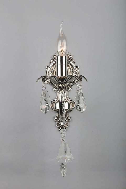 металла серебристого цвета. Поверхность арматуры матовая, рельефная. Плафон отсутствует. Декоративные элементы выполнены из прозрачного хрусталя. Осветительный прибор рассчитан на освещение пространства площадью 3 кв. м. Тип цоколя используемых ламп E14. Производитель рекомендует использовать лампы мощностью не более 60 Вт. Суммарная мощность светильника составляет 60 Вт. Лампочки в комплект не входят. Защита от попадания влаги и пыли внутрь изделия не предусмотрена. Рекомендуем к применению в гостиной, кабинете, спальне.