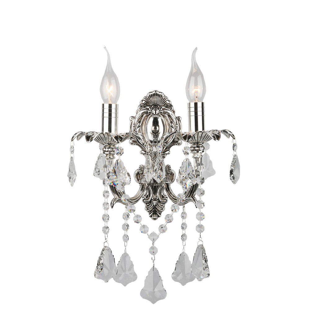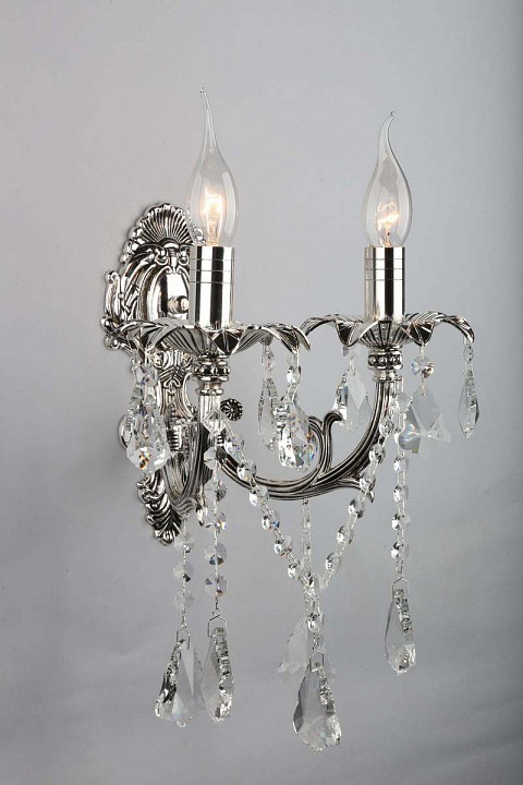 металла серебристого цвета. Поверхность арматуры матовая, рельефная. Плафон отсутствует. Декоративные элементы выполнены из прозрачного хрусталя. Осветительный прибор рассчитан на освещение пространства площадью 6 кв. м. Тип цоколя используемых ламп E14. Производитель рекомендует использовать лампы мощностью не более 60 Вт. Суммарная мощность светильника составляет 120 Вт. Лампочки в комплект не входят. Защита от попадания влаги и пыли внутрь изделия не предусмотрена. Рекомендуем к применению в гостиной, кабинете, спальне.
