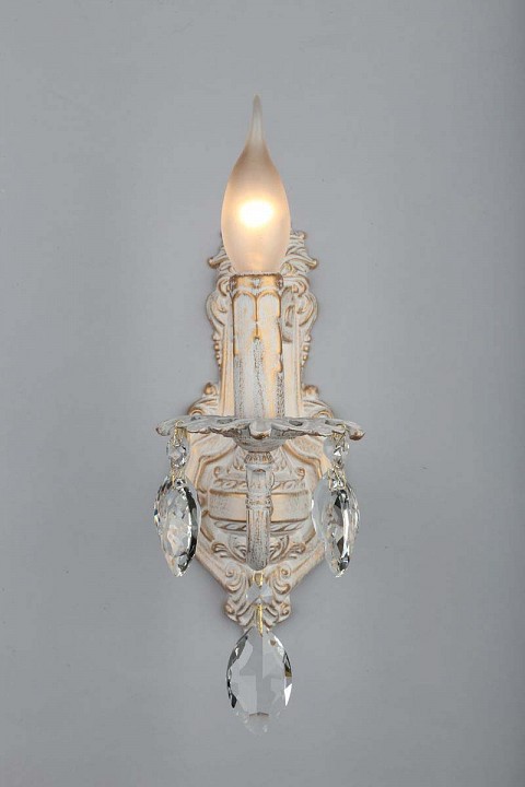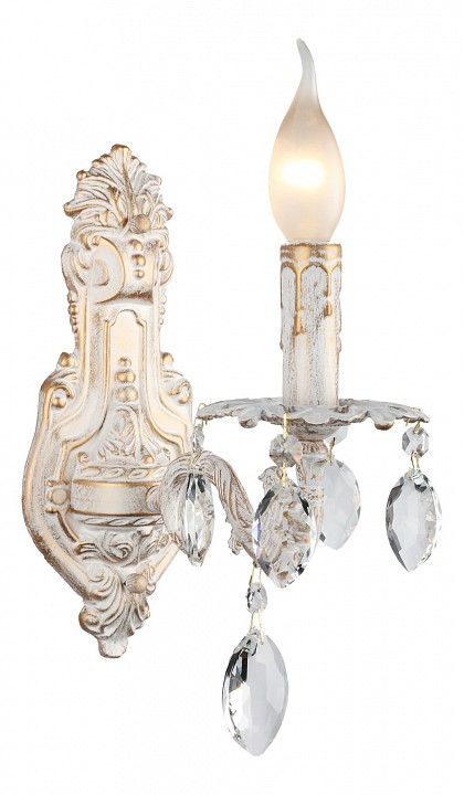 металла белого цвета с золотой патиной. Поверхность арматуры глянцевая и рельефная. Плафон отсутствует. Декоративные элементы выполнены из прозрачного хрусталя. Осветительный прибор рассчитан на освещение пространства площадью 3 кв. м. Тип цоколя используемых ламп E14. Производитель рекомендует использовать лампы мощностью не более 60 Вт. Суммарная мощность светильника составляет 60 Вт. Лампочки в комплект не входят. Защита от попадания влаги и пыли внутрь изделия не предусмотрена. Рекомендуем к применению в гостиной, кабинете, спальне.