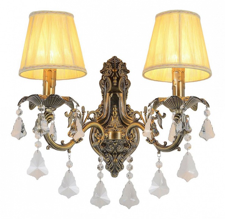 металла бронзового цвета. Поверхность арматуры глянцевая и рельефная. Плафон изготовлен из текстиля бежевого цвета, имеет конусную форму и матовую рельефную поверхность. Направлен вверх и вниз. Декоративные элементы выполнены из прозрачного хрусталя. Осветительный прибор рассчитан на освещение пространства площадью 4 кв. м. Тип цоколя используемых ламп E14. Производитель рекомендует использовать лампы мощностью не более 40 Вт. Суммарная мощность светильника составляет 80 Вт. Лампочки в комплект не входят. Защита от попадания влаги и пыли внутрь изделия не предусмотрена. Рекомендуем к применению в гостиной, кабинете, спальне.
