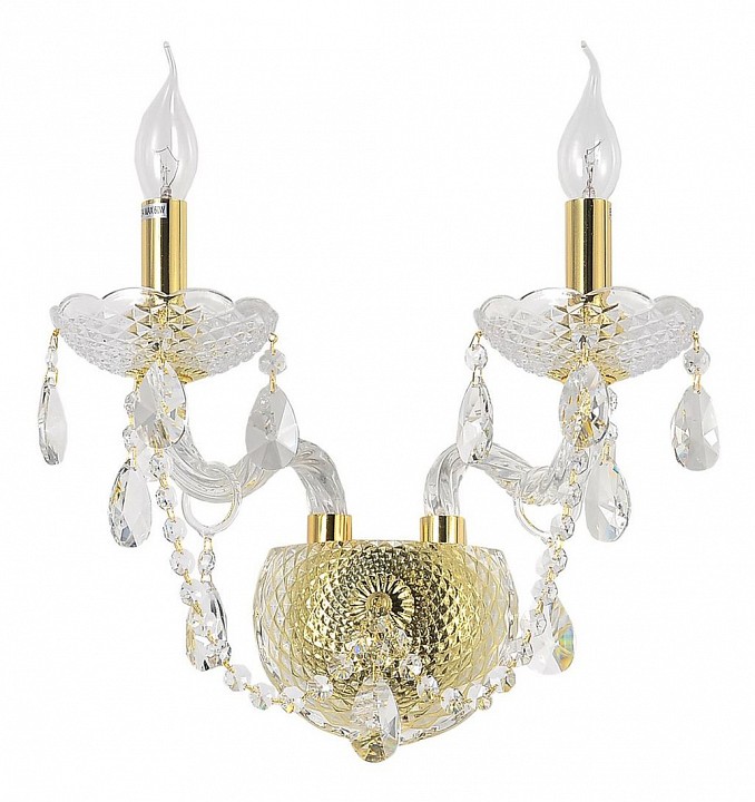 металла и стекла золотого и прозрачного цветов. Поверхность арматуры глянцевая. Плафон отсутствует. Декоративные элементы выполнены из прозрачного хрусталя. Осветительный прибор рассчитан на освещение пространства площадью 4 кв. м. Тип цоколя используемых ламп E14. Производитель рекомендует использовать лампы мощностью не более 40 Вт. Суммарная мощность светильника составляет 80 Вт. Лампочки в комплект не входят. Защита от попадания влаги и пыли внутрь изделия не предусмотрена. Рекомендуем к применению в гостиной, кабинете, спальне.