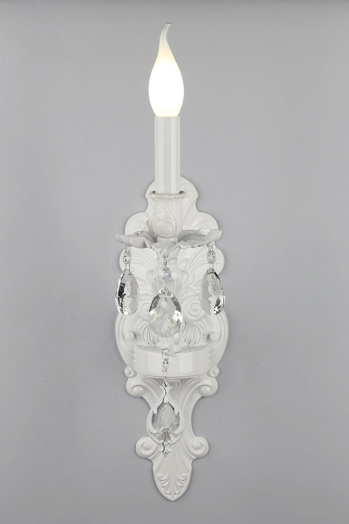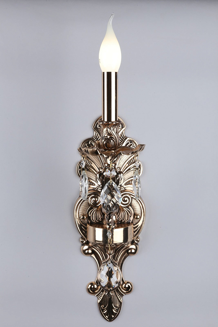 металла золотого цвета. Поверхность арматуры глянцевая и рельефная. Плафон отсутствует. Декоративные элементы выполнены из прозрачного хрусталя. Осветительный прибор рассчитан на освещение пространства площадью 2 кв. м. Тип цоколя используемых ламп E14. Производитель рекомендует использовать лампы мощностью не более 40 Вт. Суммарная мощность светильника составляет 40 Вт. Лампочки в комплект не входят. Защита от попадания влаги и пыли внутрь изделия не предусмотрена. Рекомендуем к применению в гостиной, кабинете, спальне.