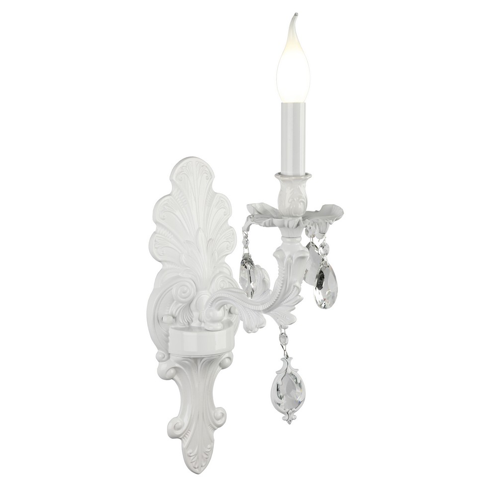 металла белого цвета. Поверхность арматуры матовая, рельефная. Плафон отсутствует. Декоративные элементы выполнены из прозрачного хрусталя. Осветительный прибор рассчитан на освещение пространства площадью 2 кв. м. Тип цоколя используемых ламп E14. Производитель рекомендует использовать лампы мощностью не более 40 Вт. Суммарная мощность светильника составляет 40 Вт. Лампочки в комплект не входят. Защита от попадания влаги и пыли внутрь изделия не предусмотрена. Рекомендуем к применению в гостиной, кабинете, спальне.