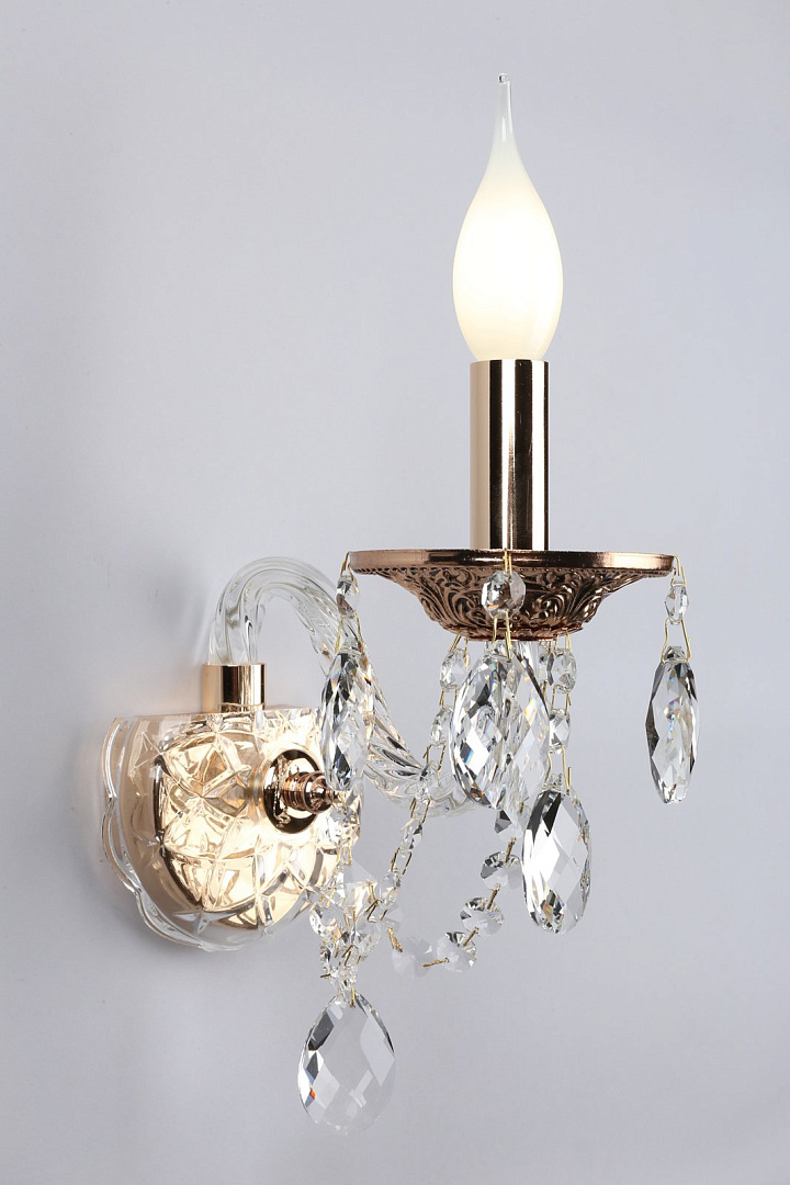 металла золотого цвета. Поверхность арматуры глянцевая. Плафон отсутствует. Декоративные элементы выполнены из прозрачного хрусталя. Осветительный прибор рассчитан на освещение пространства площадью 2 кв. м. Тип цоколя используемых ламп E14. Производитель рекомендует использовать лампы мощностью не более 40 Вт. Суммарная мощность светильника составляет 40 Вт. Лампочки в комплект не входят. Защита от попадания влаги и пыли внутрь изделия не предусмотрена. Рекомендуем к применению в гостиной, кабинете, спальне.