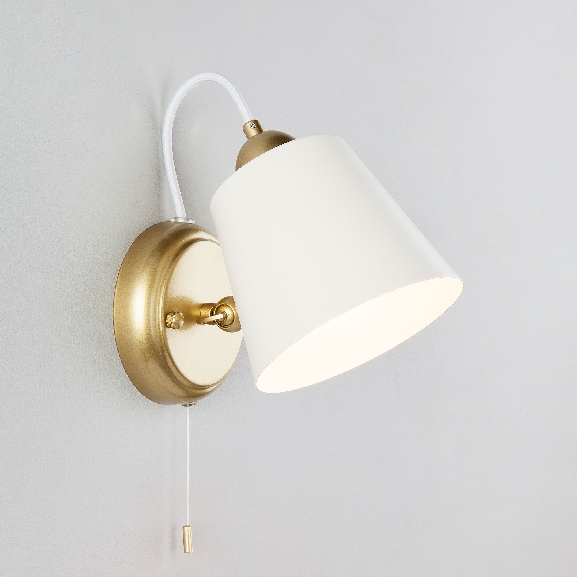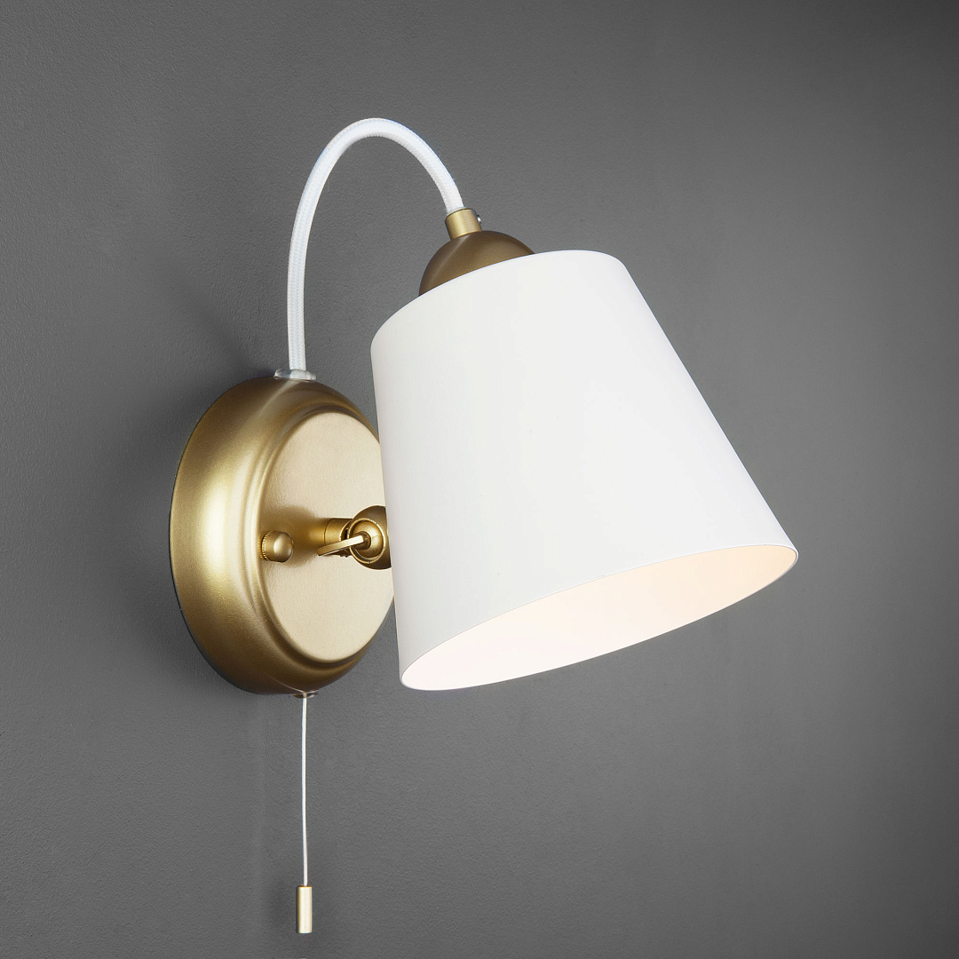 металла золотого цвета. Поверхность арматуры глянцевая. Плафон изготовлен из металла белого цвета, имеет конусную форму Направлен вниз. Осветительный прибор рассчитан на освещение пространства площадью 5 кв. м. Тип цоколя используемых ламп E27. Производитель рекомендует использовать лампы мощностью не более 60 Вт. Суммарная мощность светильника составляет 60 Вт. Лампочки в комплект не входят. Защита от попадания влаги и пыли внутрь изделия не предусмотрена. Рекомендуем к применению в гостиной, спальне, прихожей, коридоре.