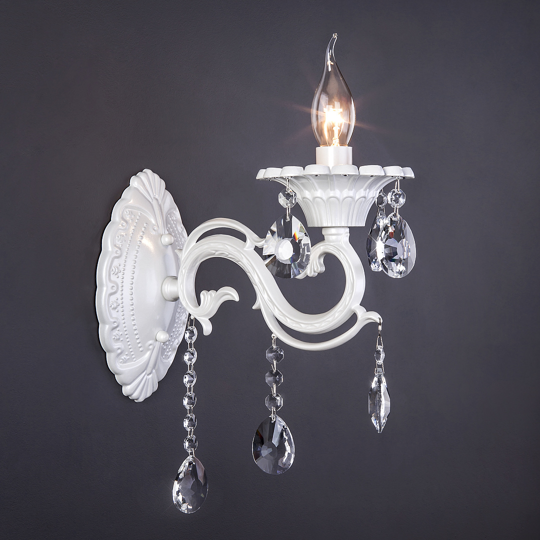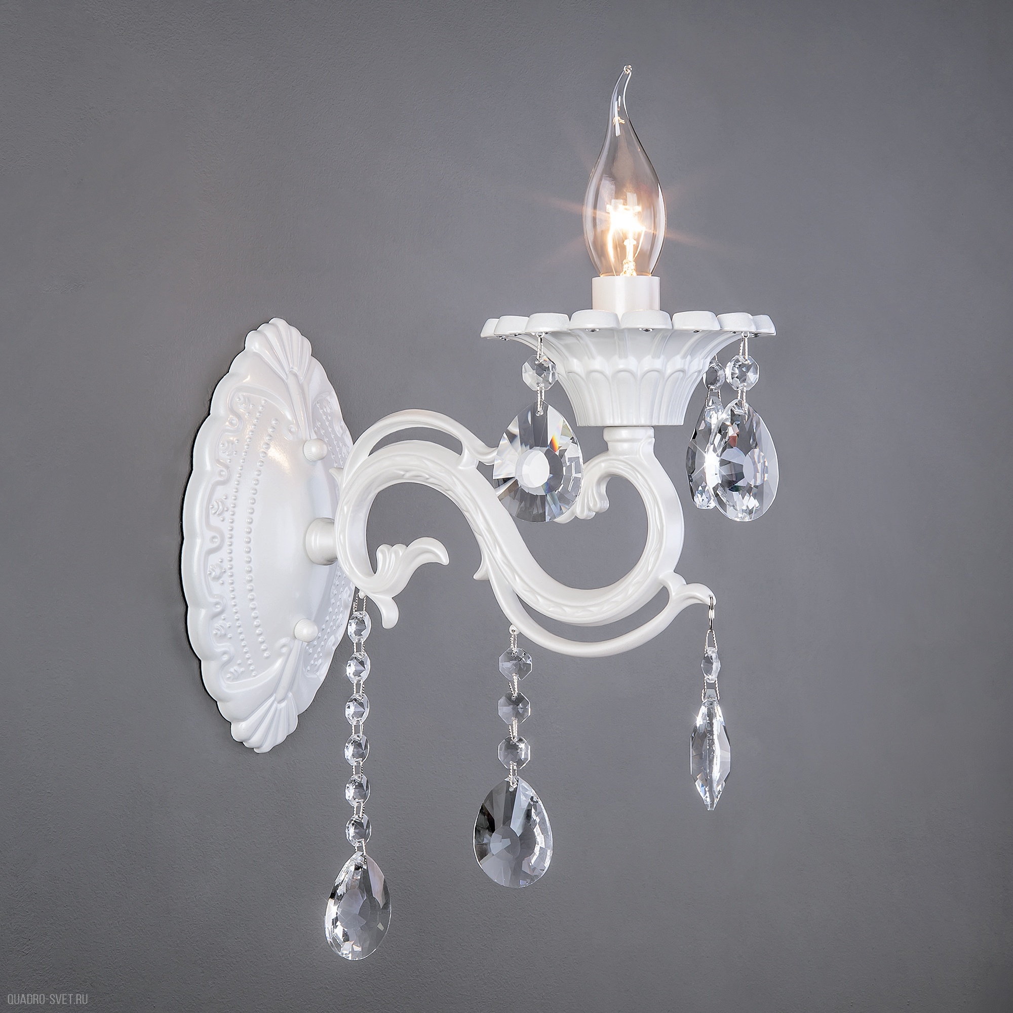 металла белого цвета. Поверхность арматуры глянцевая. Плафон отсутствует. Лампы направленывверх. Декоративные элементы выполнены из прозрачного хрусталя. Осветительный прибор рассчитан на освещение пространства площадью 5 кв. м. Тип цоколя используемых ламп E14. Производитель рекомендует использовать лампы мощностью не более 60 Вт. Суммарная мощность светильника составляет 60 Вт. Лампочки в комплект не входят. Защита от попадания влаги и пыли внутрь изделия не предусмотрена. Рекомендуем к применению в гостиной, спальне, прихожей, коридоре.