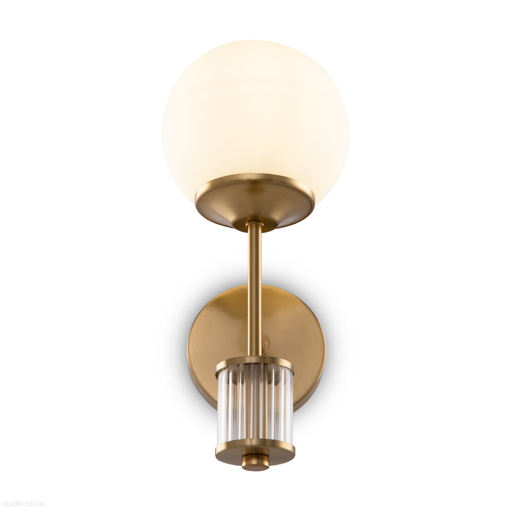 Металлическая арматура окрашена в цвет латуни. Плафоны-сферы из матового белого стекла. Декор – прозрачное рельефное стекло. Источник света – лампа с цоколем Е27.