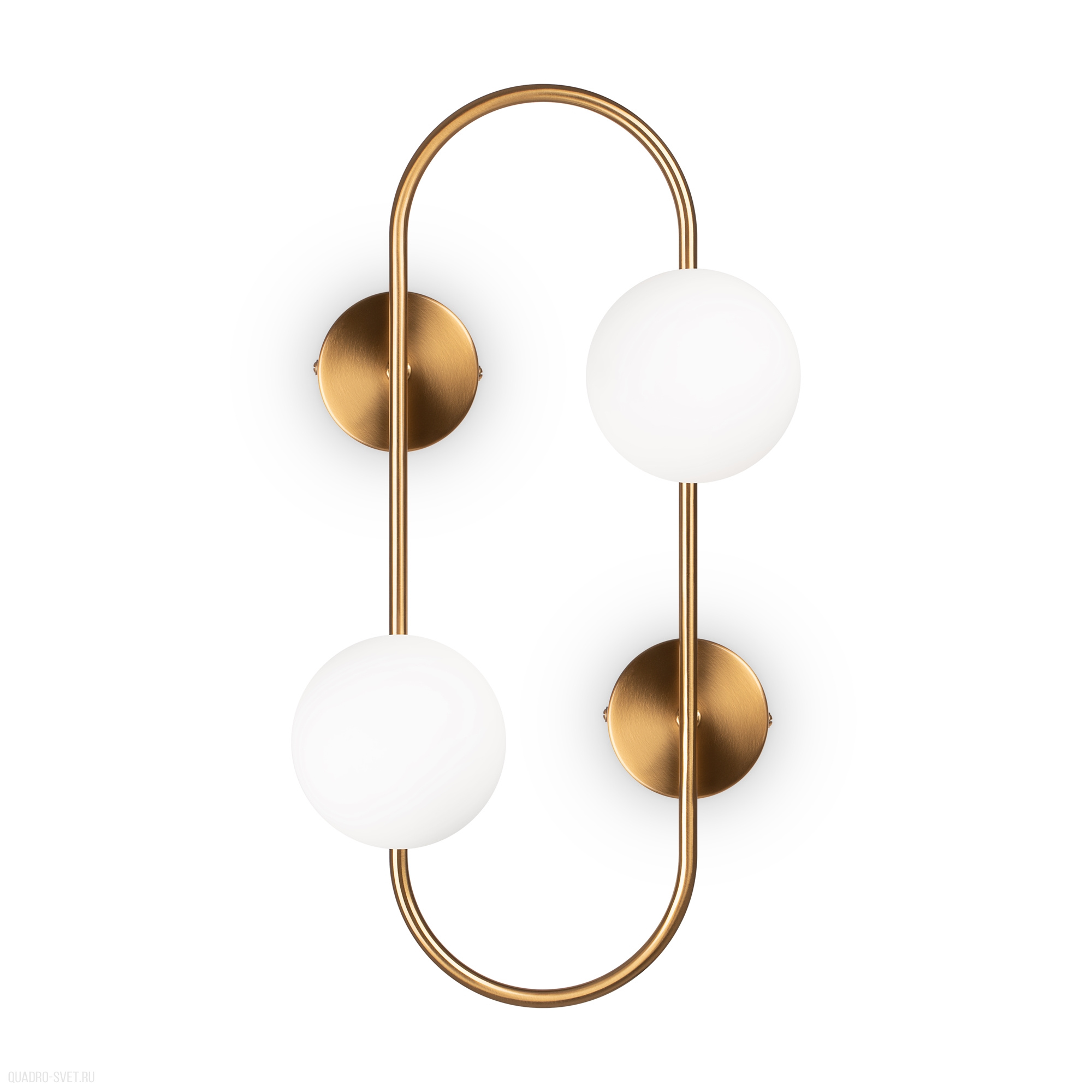 Арматура – металл, цвет – латунь. Стеклянные плафоны-сферы выполнены в двух оттенках: белый матовый и дымчатый, который присутствует только в настенно-потолочной версии. Округлые и плавные линии – беспроигрышное сочетание для современных интерьеров. Настенные бра можно использовать как для общего освещения на потолке, так и для зонального настенного. Источник света – лампа с цоколем G9.