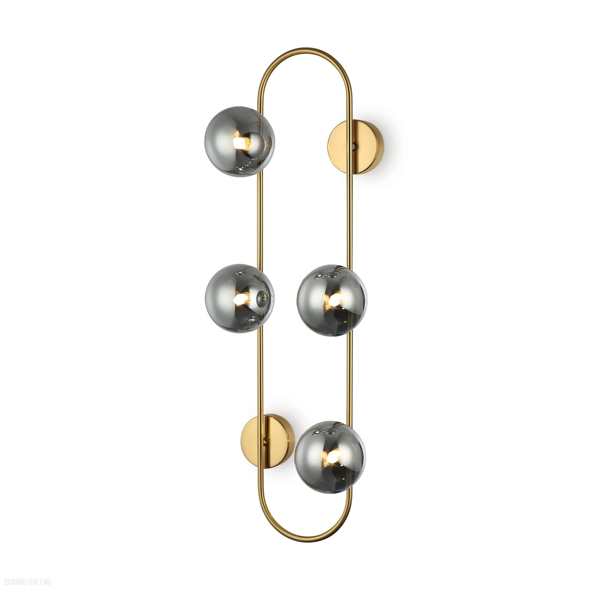 Арматура – металл, цвет – латунь. Стеклянные плафоны-сферы выполнены в двух оттенках: белый матовый и дымчатый, который присутствует только в настенно-потолочной версии. Округлые и плавные линии – беспроигрышное сочетание для современных интерьеров. Настенные бра можно использовать как для общего освещения на потолке, так и для зонального настенного. Источник света – лампа с цоколем G9.