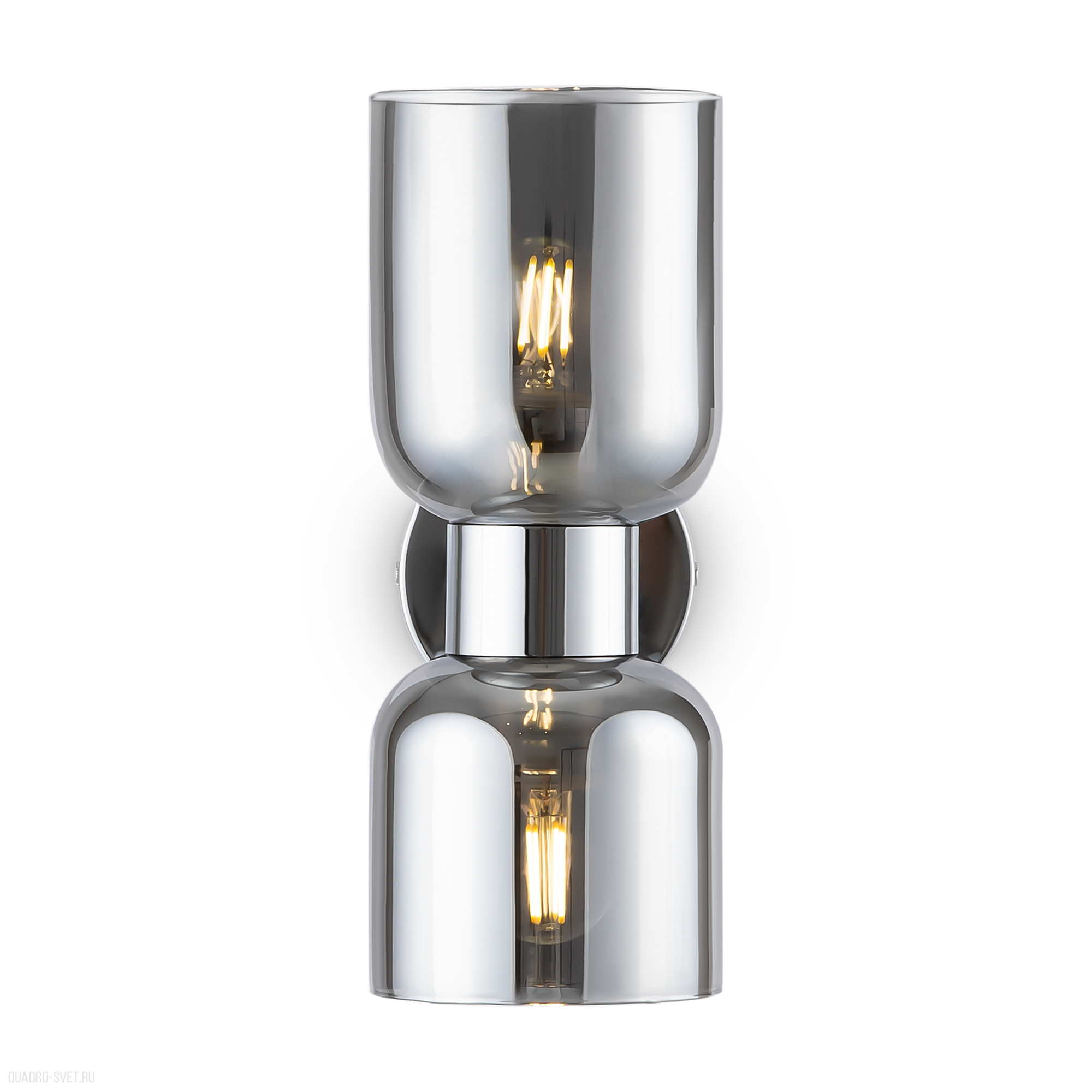 Арматура из металла. Оттенки – хром и латунь. Стеклянные плафоны в двух цветовых решениях: белый глянец и хром с зеркальным эффектом. Оригинальная форма плафонов «песочные часы», двунаправленный световой поток. Широкий ассортимент. Источник света – лампа с цоколем E27.
