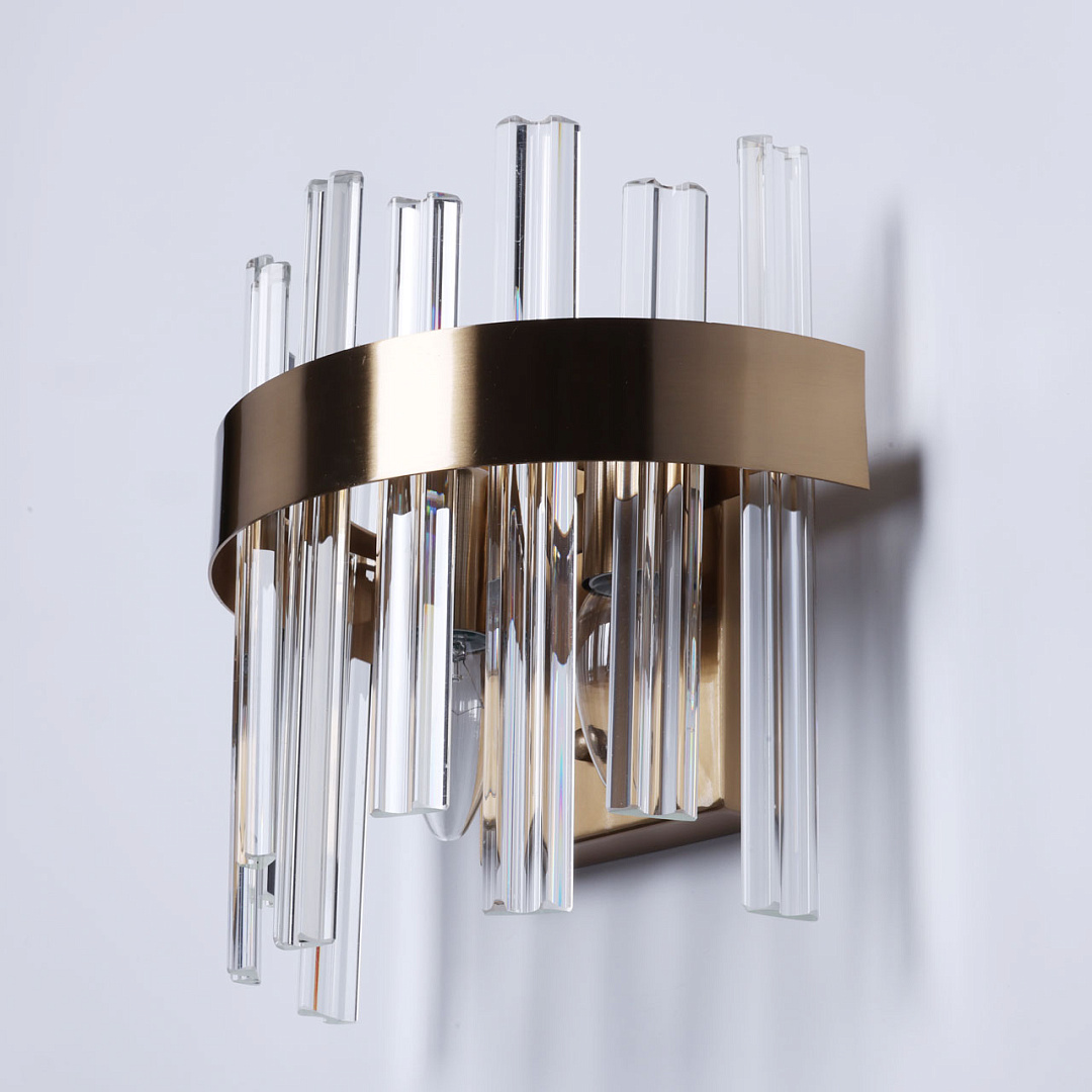 Дизайн-идея настенного бра с оригинальным декором из фактурного стекла - игра света через рельефные грани. Классический цвет латуни основания бра подойдет и в классические и в современные интерьеры. Заменяемый источник света удобен в эксплуатации.