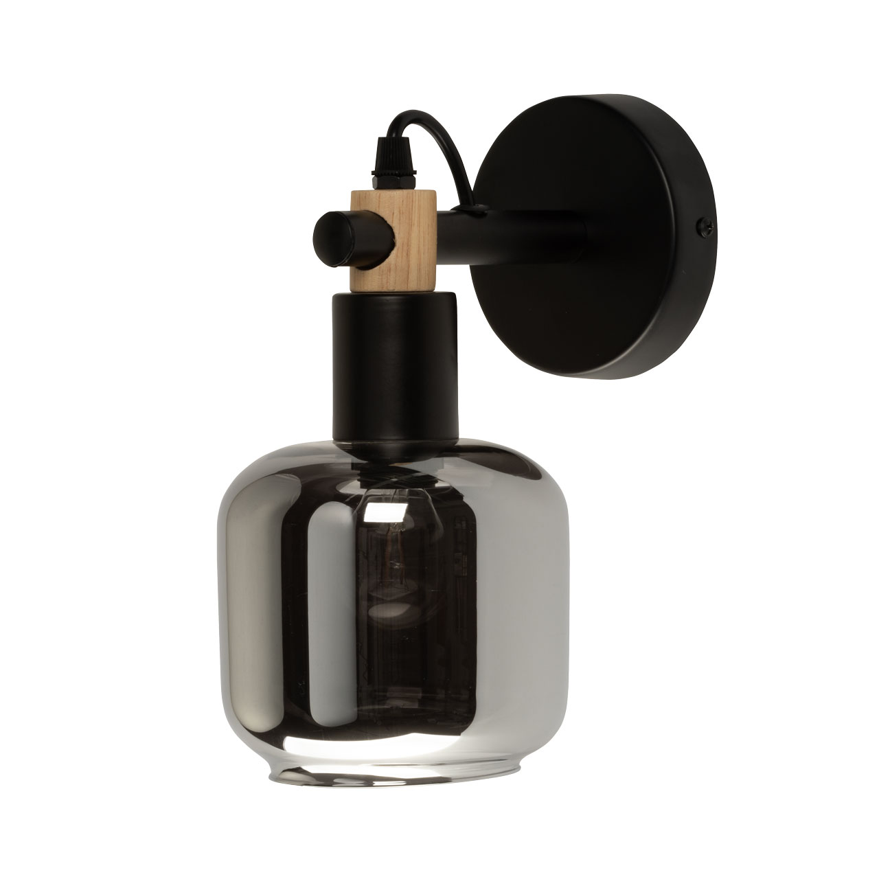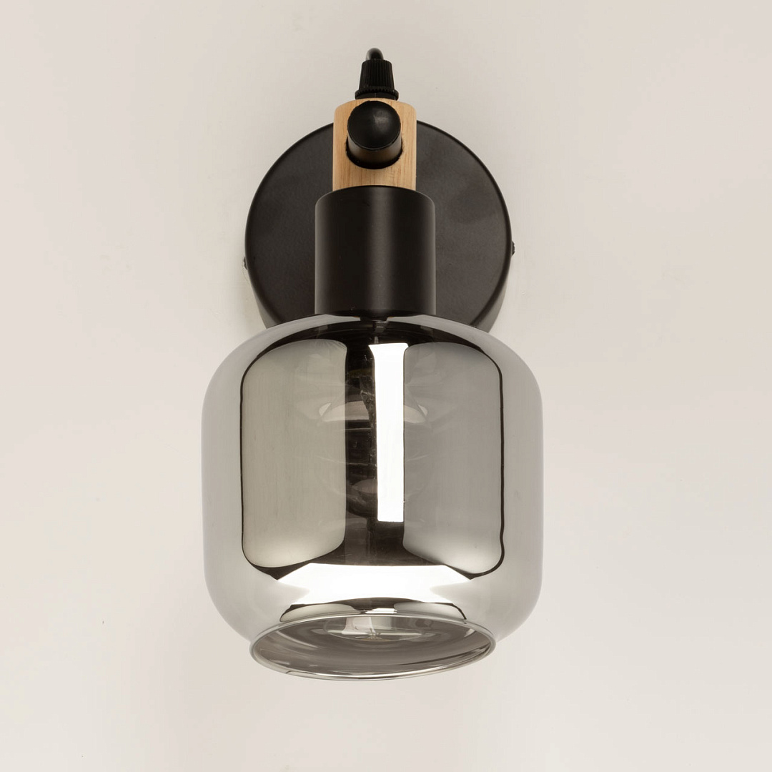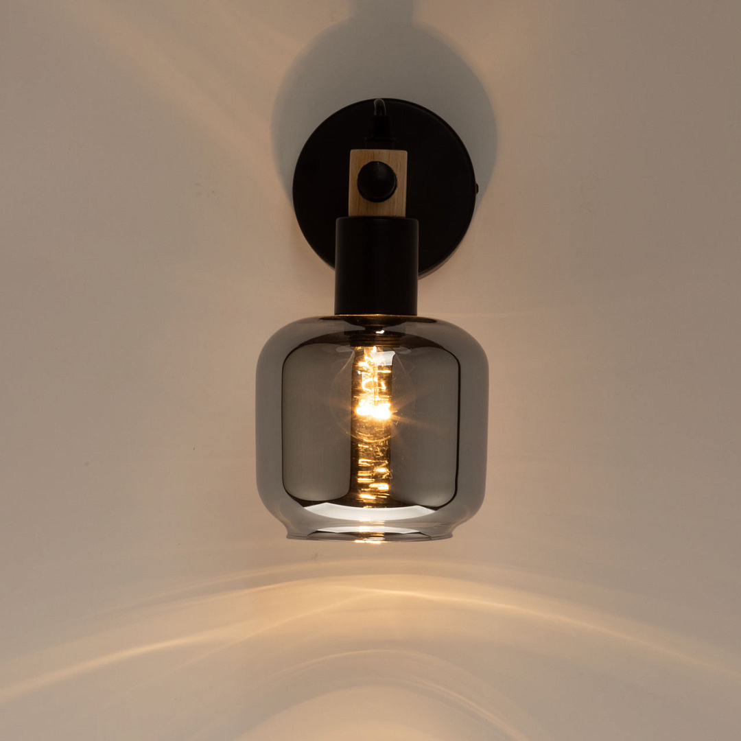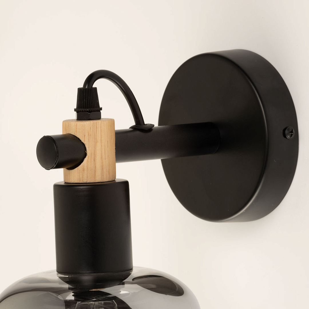 Настенное бра в брутальном черном цвете идеально дополнит современный интерьер в стиле лофт. Плафон из дымчатого стекла обеспечит комфортное освещение. Декоративные элементы из натурального дерева подчеркнут природный стиль. Заменяемый источник света прост и практичен в эксплуатации.