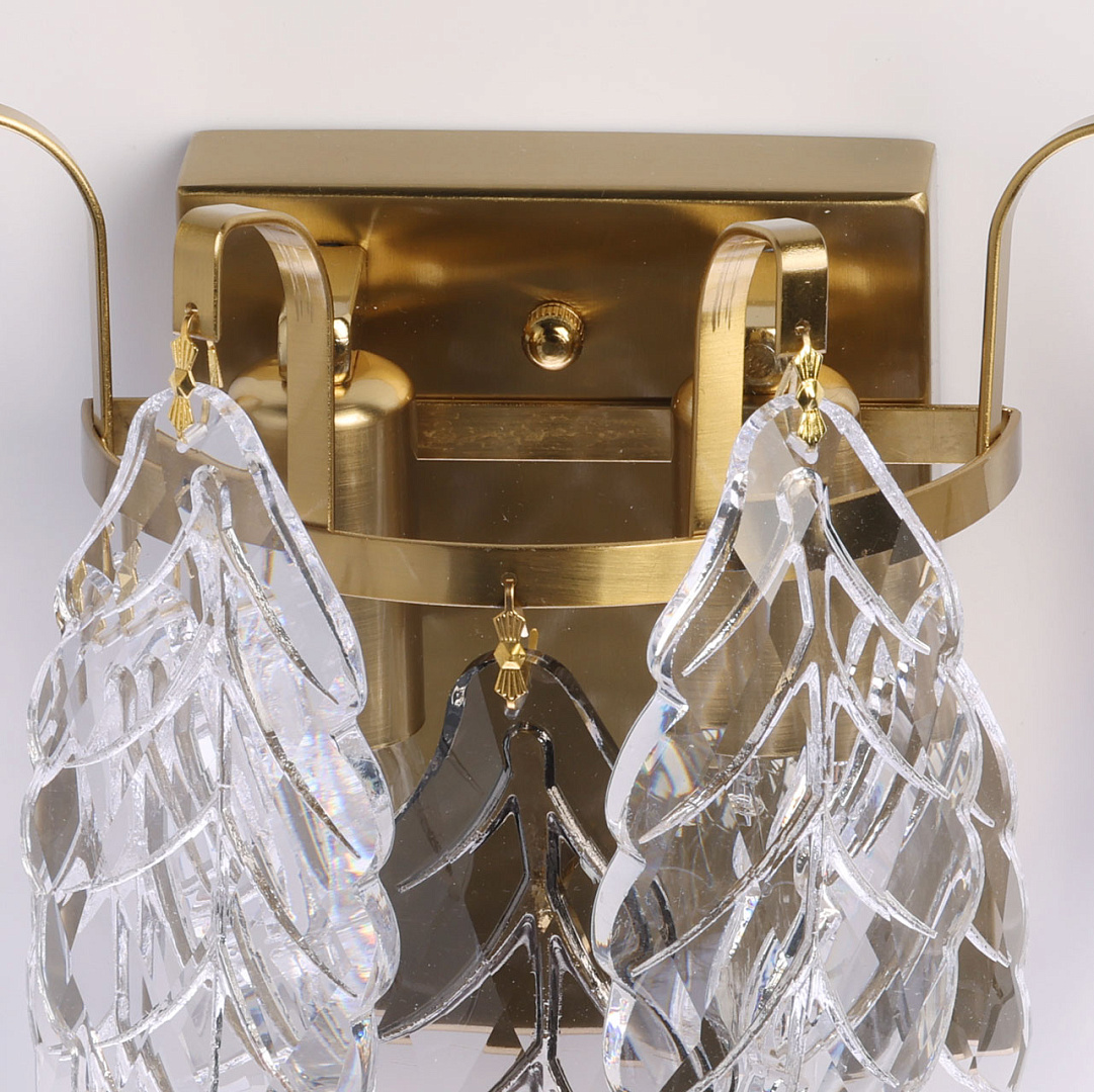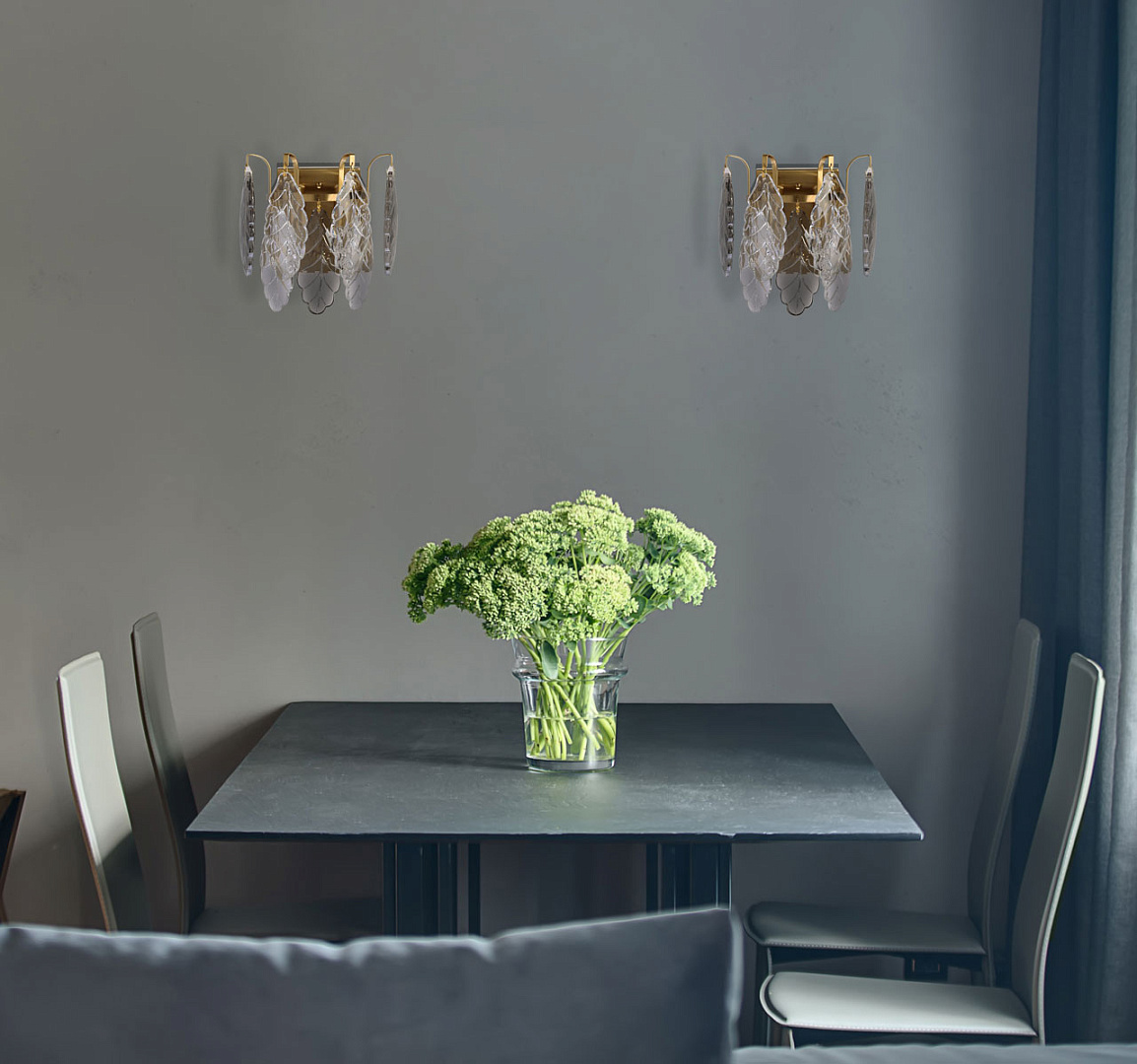 Необычный дизайн настенного бра за счет декора двух цветов.Прозрачное и дымчатое стекло высокого качества имитирует листья.Стеклянный декор создает красивый рисунок и изысканную игру бликов.Заменяемые источники света удобны в эксплуатации.