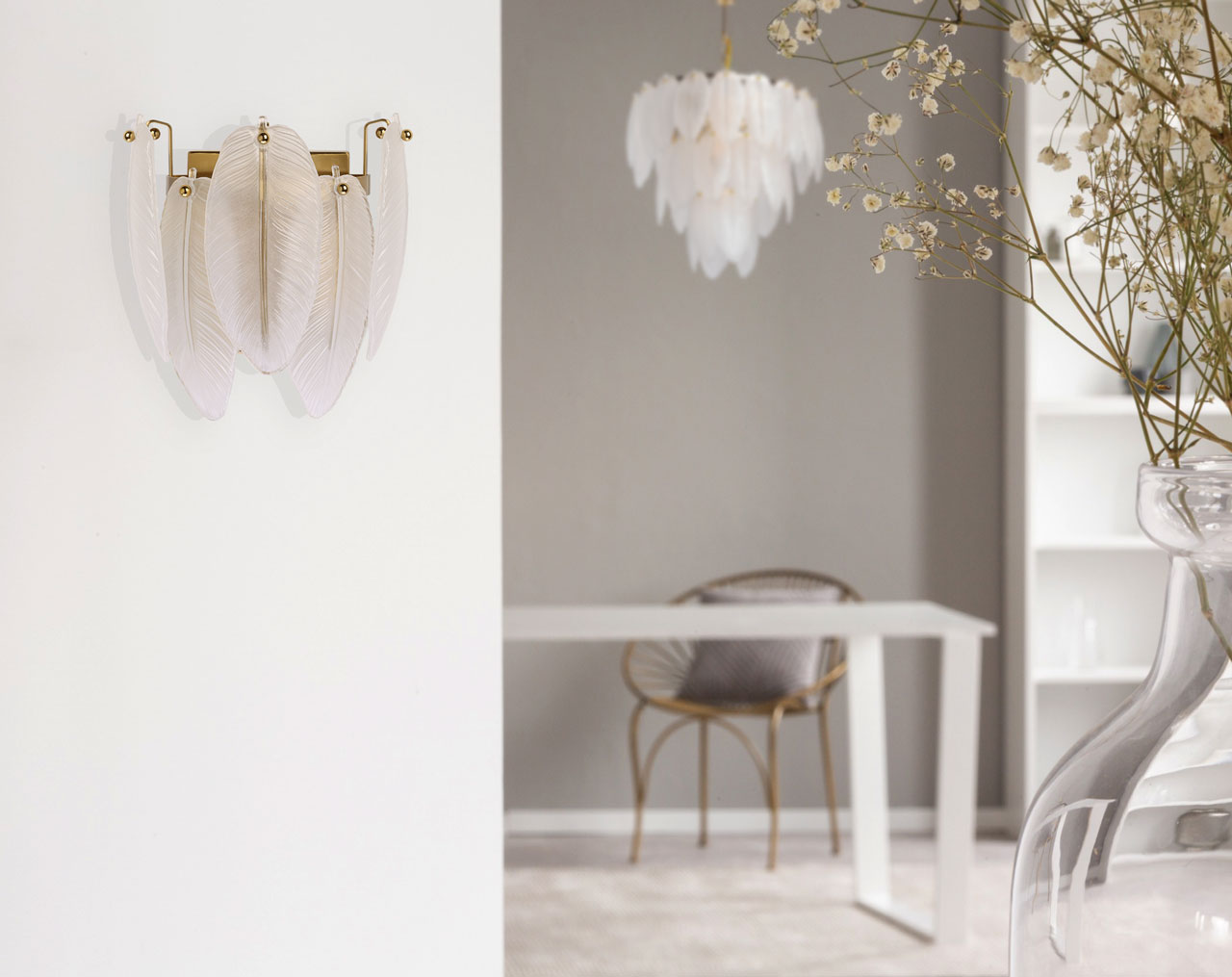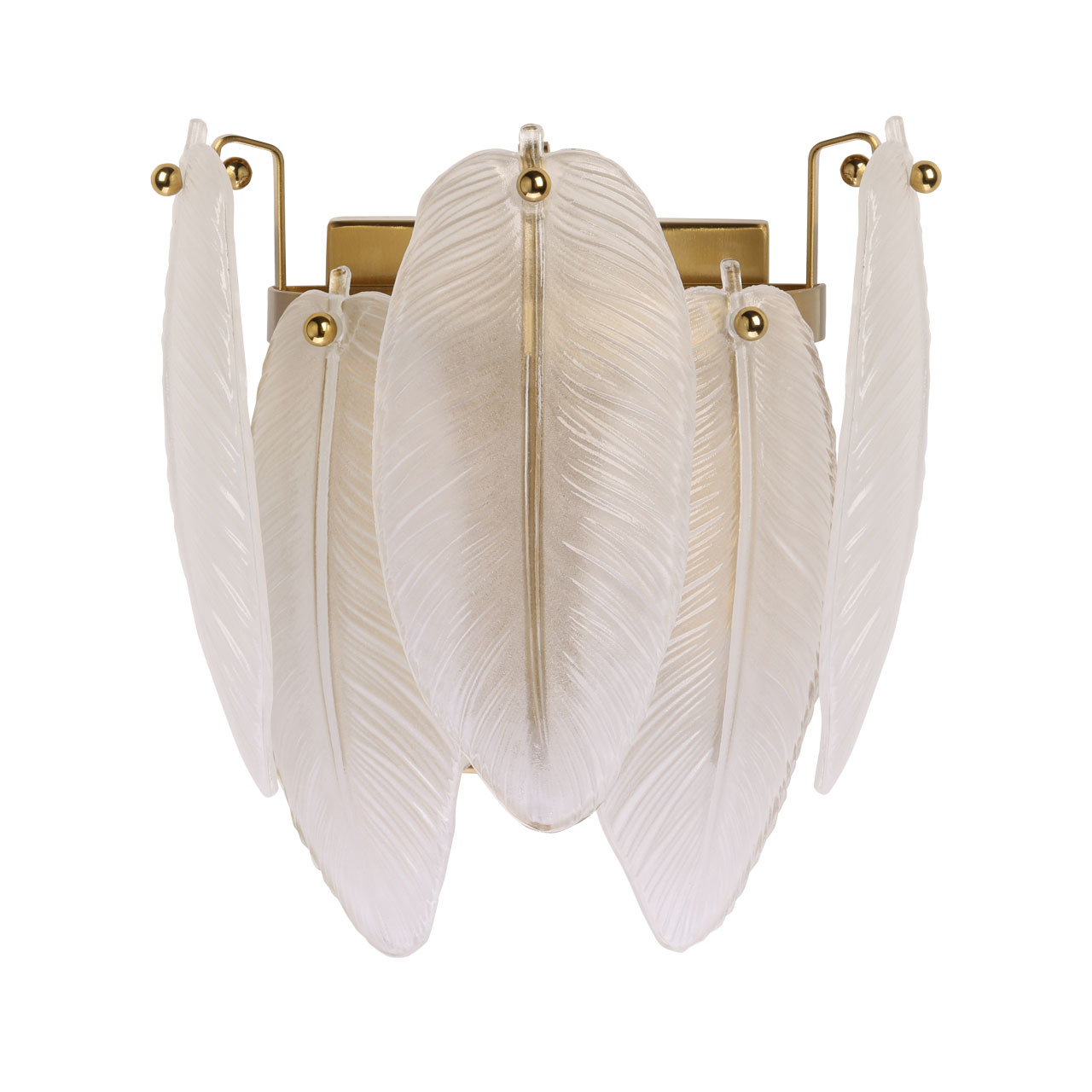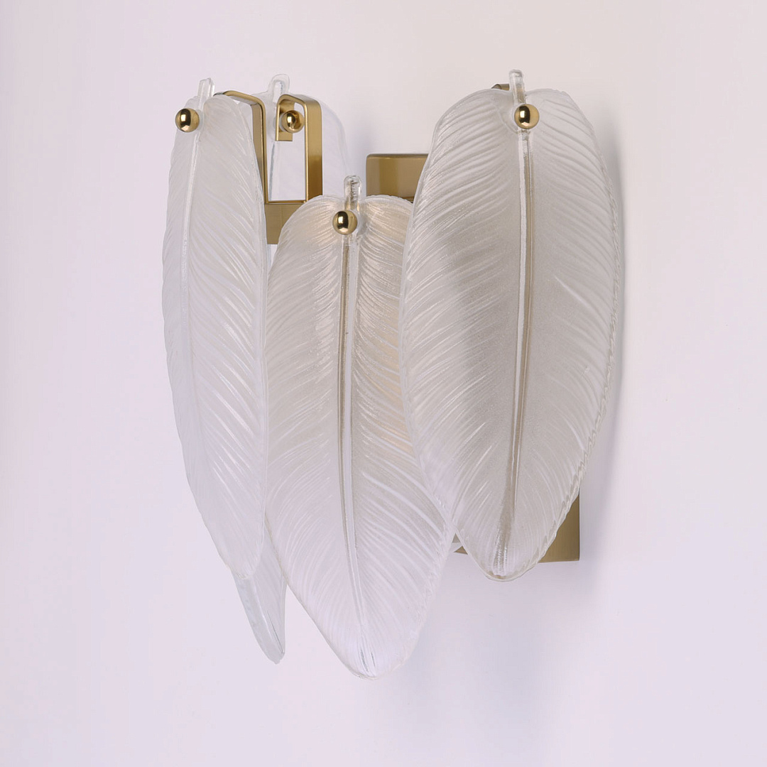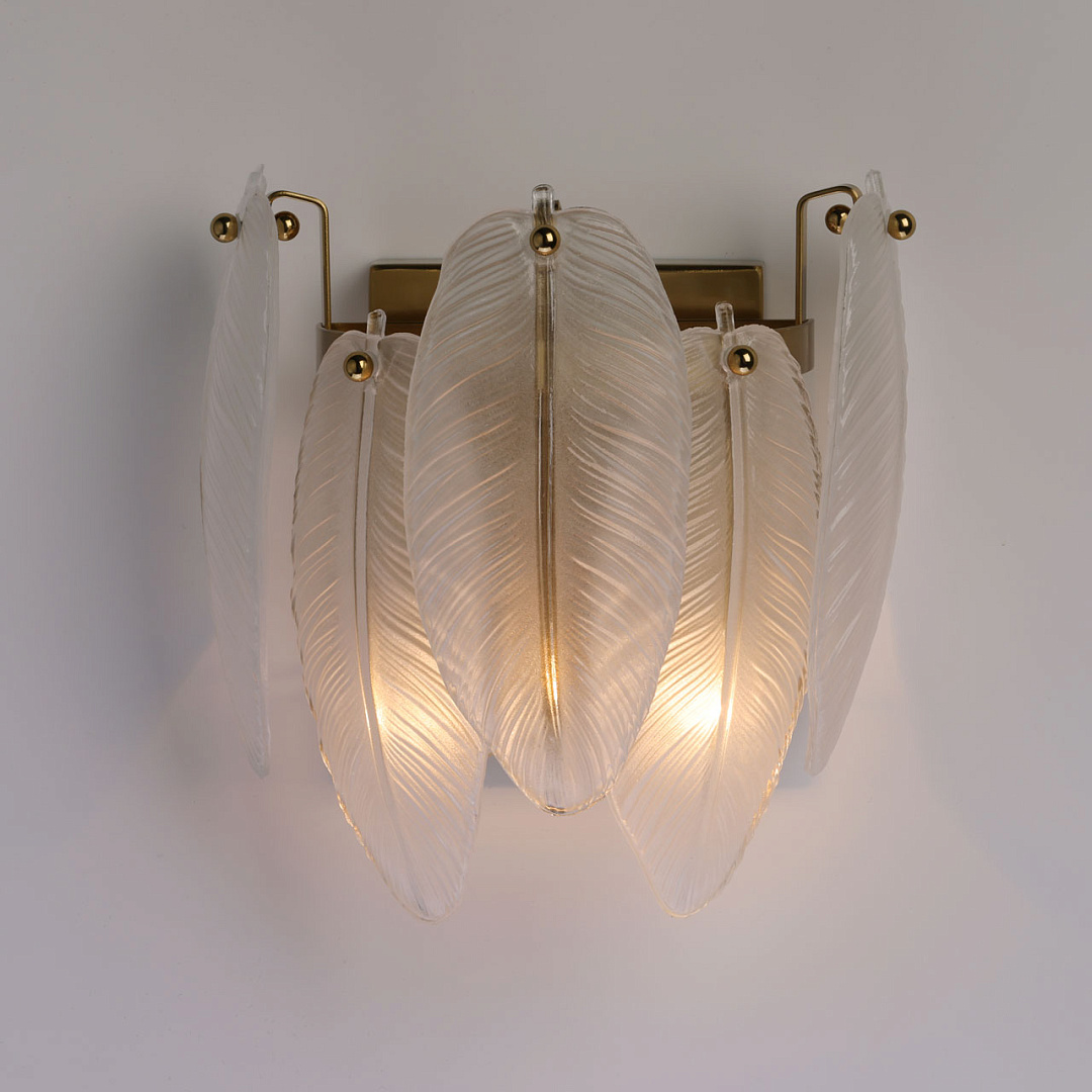 Цвет латуни сохраняет свою актуальность.Стеклянные листья тонкой работы соответствуют тренду природности.Матированный декор из стекла создает мягкий и уютный свет.Заменяемые источники света удобны в эксплуатации.