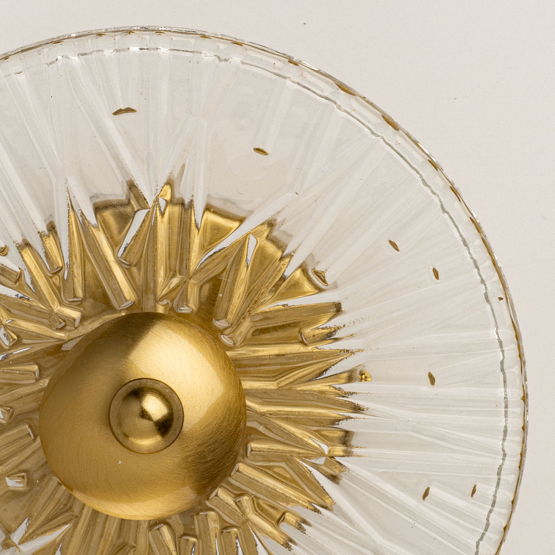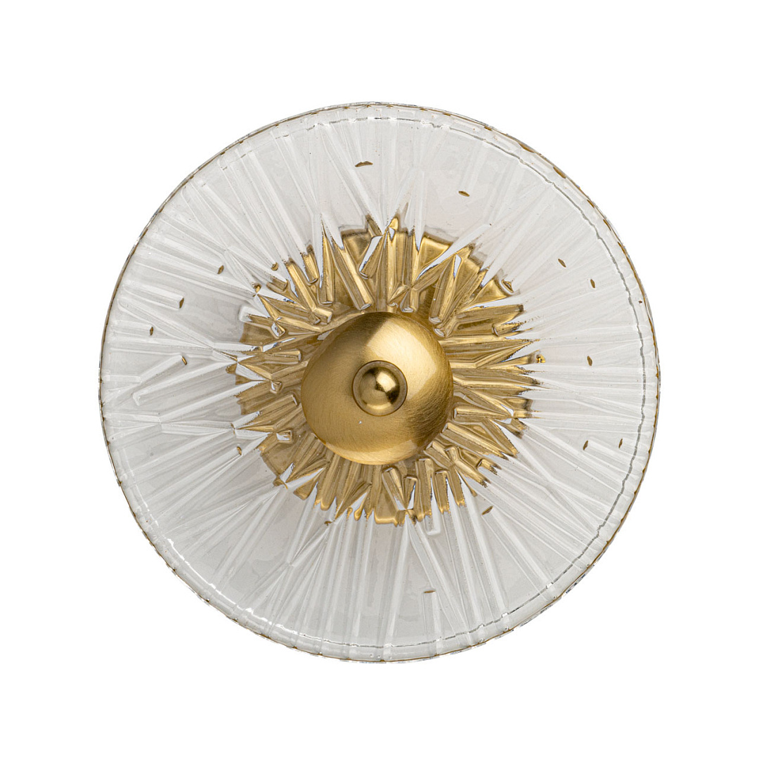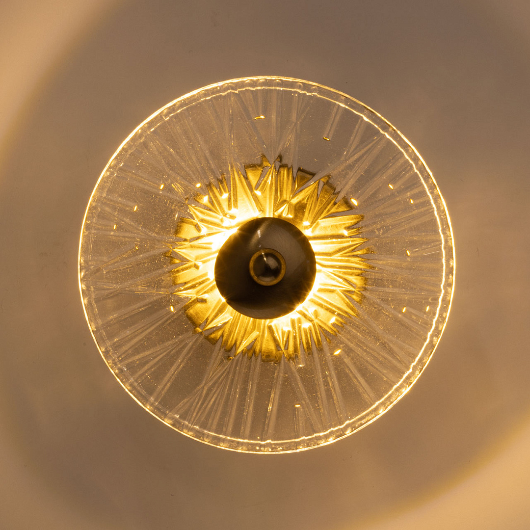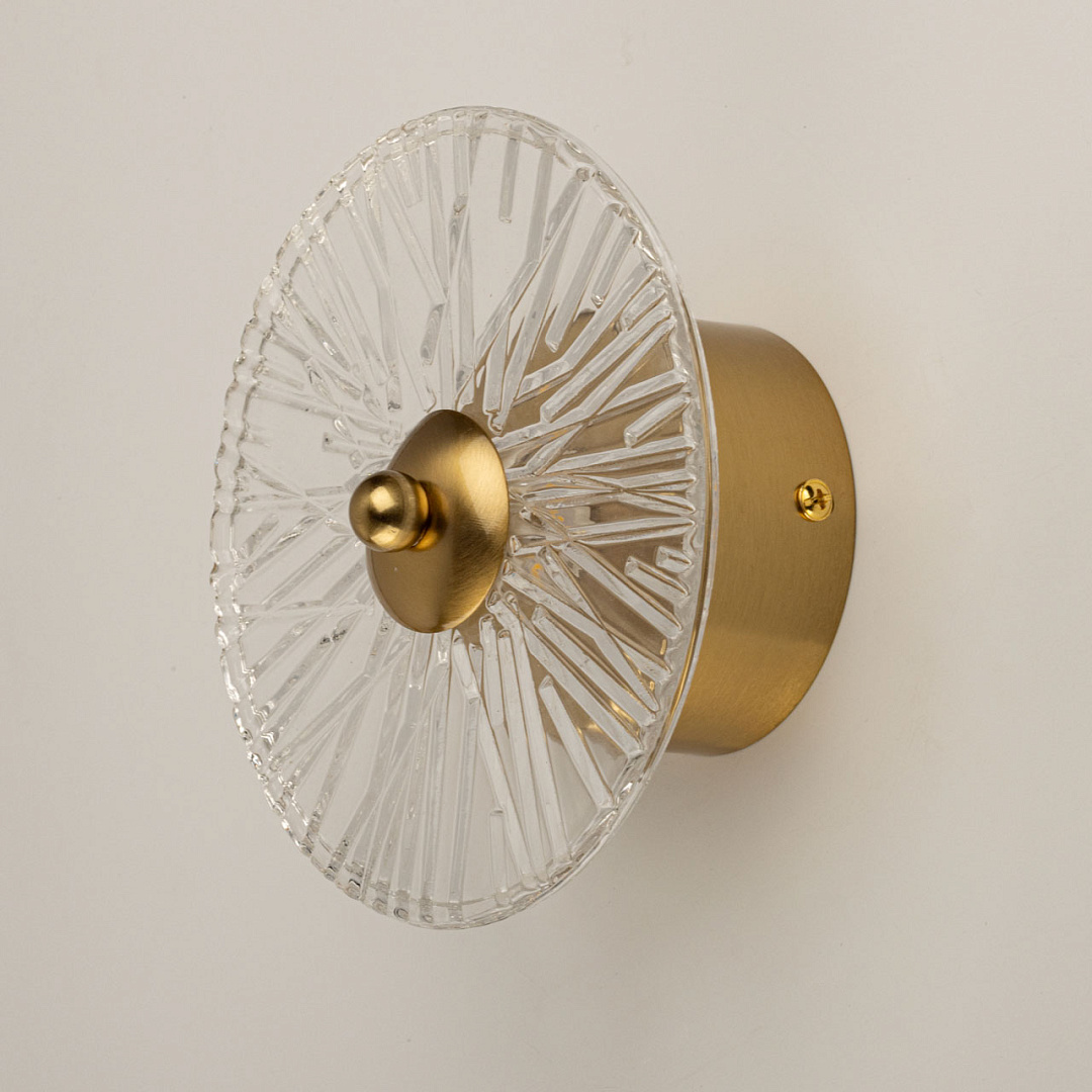 Латунное покрытие придает основанию бра теплый и элегантный вид, который хорошо сочетается с различными стилями интерьера. Рельефная текстура стекла добавляет интересный визуальный эффект и игру света.Прозрачное стекло с рельефом рассеивает свет, создавая мягкое и равномерное освещение, что делает атмосферу в помещении более уютной и комфортной для глаз.Многорежимность с изменением цветовой температуры от 3000К до 6000К является элементом светодизайна и позволяет подобрать комфортную температуру света с помощью настенного выключателя. Качественные светодиоды и корпус из сплава алюминия  обеспечивают яркое освещение и долгий срок службы. Светодиодные источники света экономичны и безопасны.
