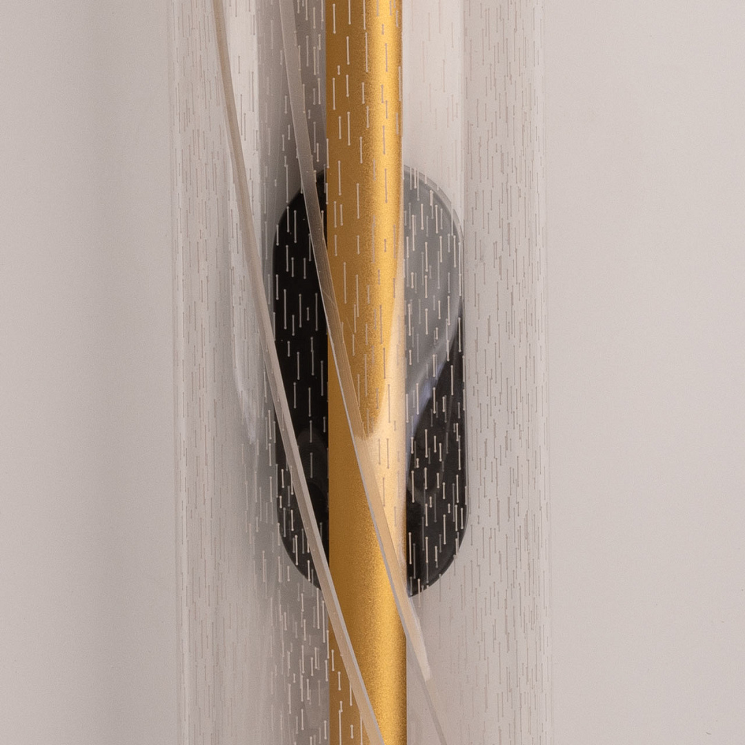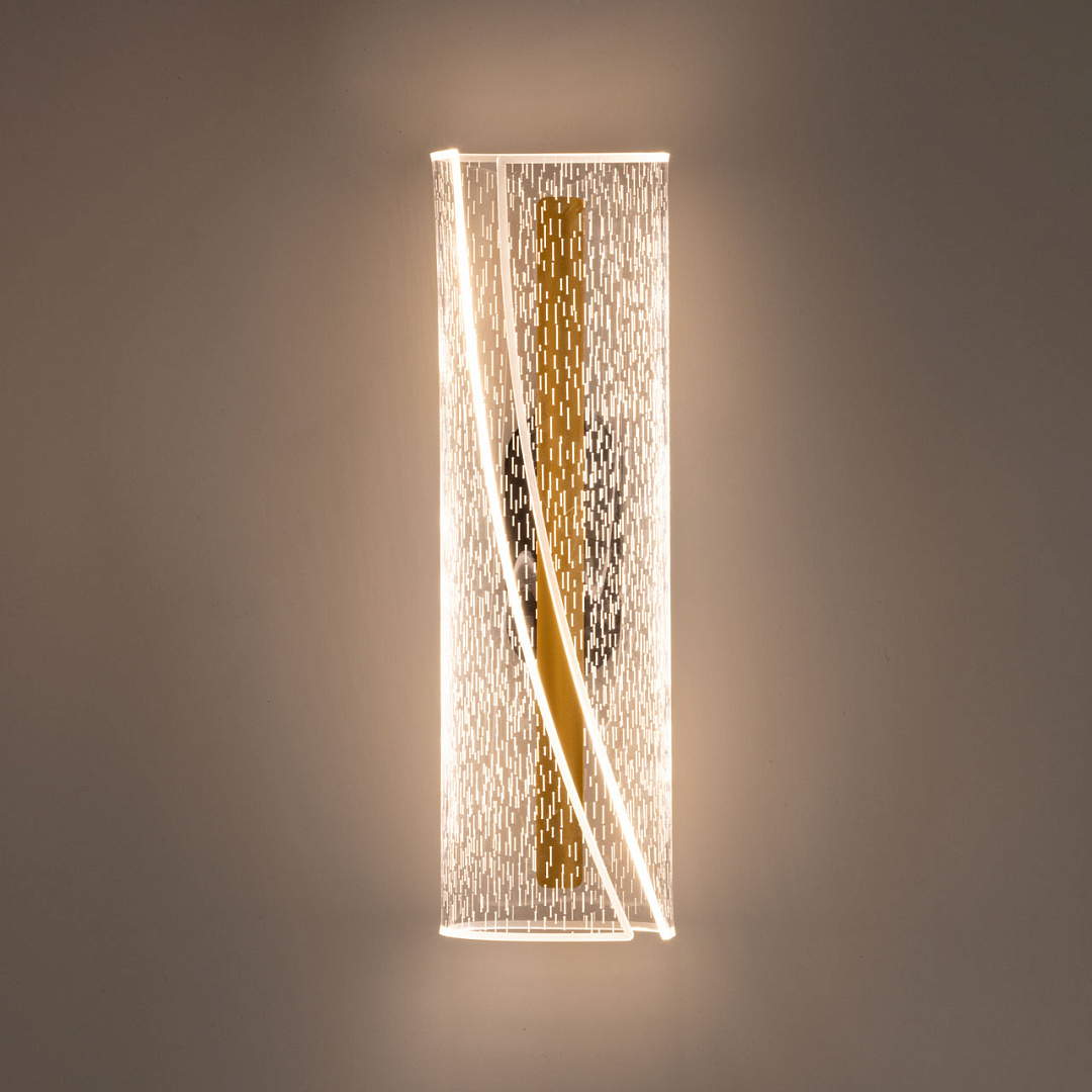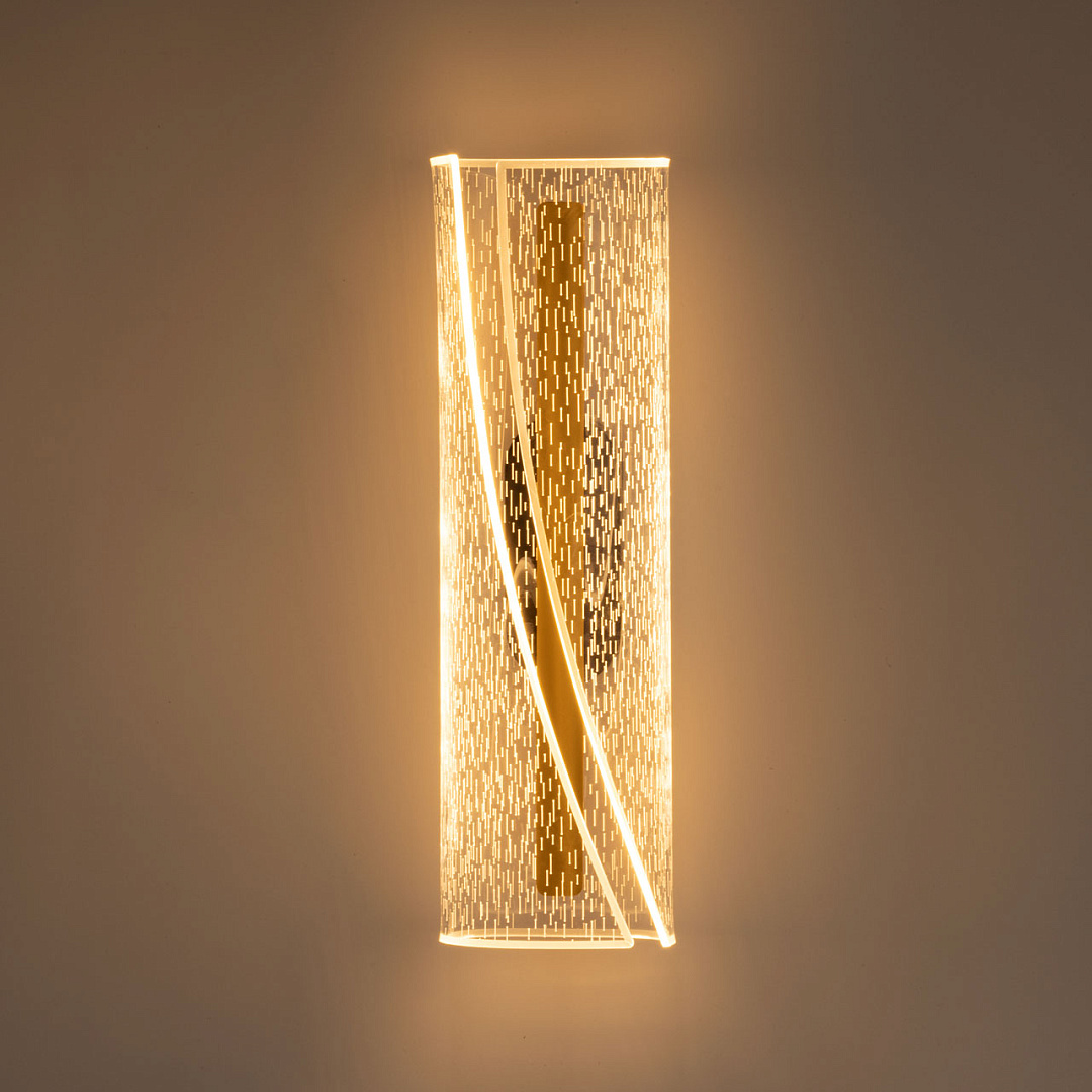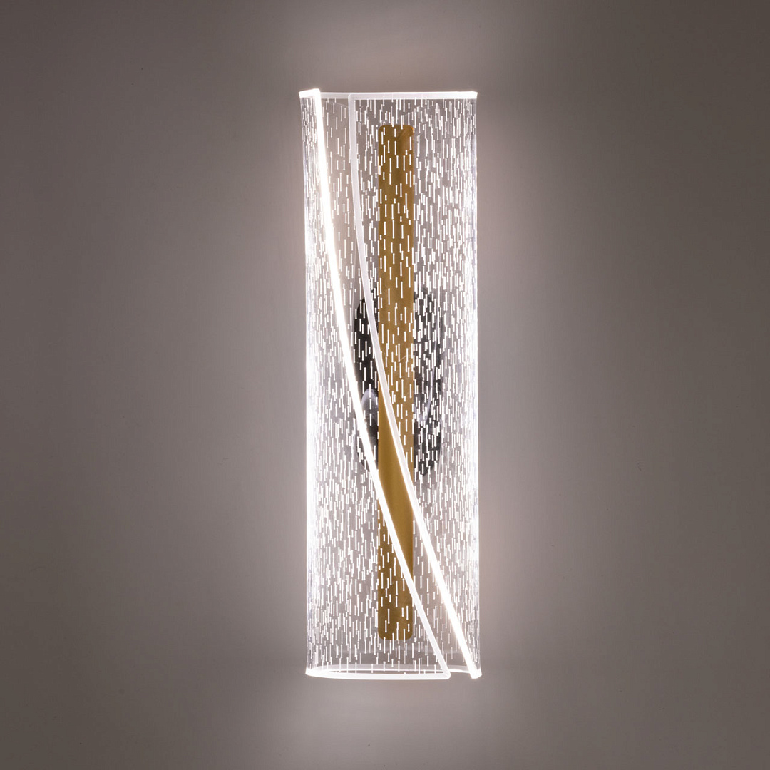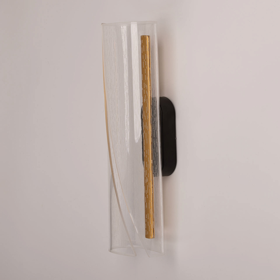 Современное настенное бра универсально подойдет в классический и современный интерьеры. Для придания дополнительного шарма в настенном бра контрастно сочетается черное основание и золотистые элементы. Эффектный плафон из прозрачного акрила с рисунком плавно рассеивает свет. Многорежимность с изменением цветовой температуры от 3000К до 6500К является элементом светодизайна и позволяет подобрать комфортную температуру света. Качественные светодиоды и корпус из сплава алюминия  обеспечивают яркое освещение и долгий срок службы. Светодиодные источники света экономичны и безопасны.