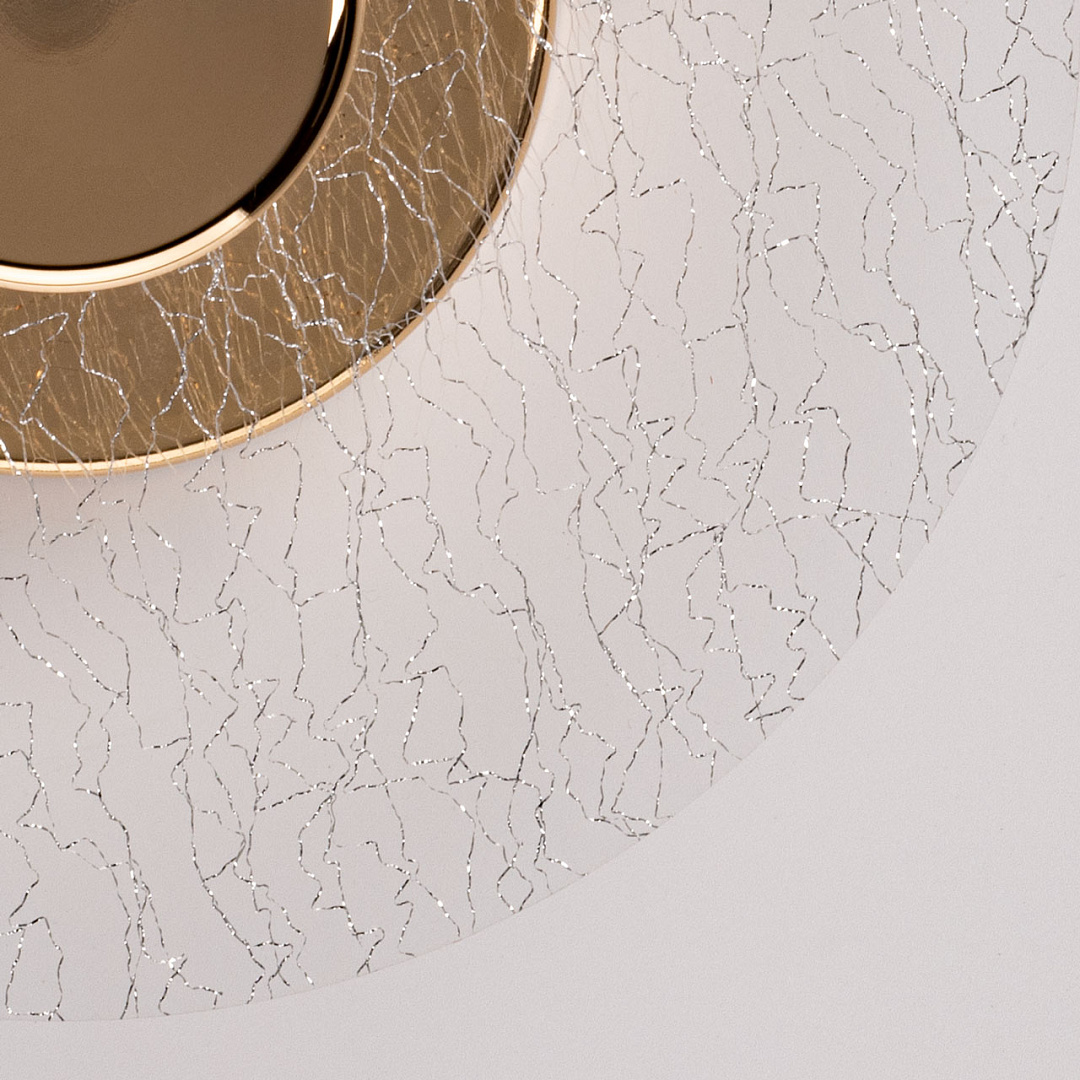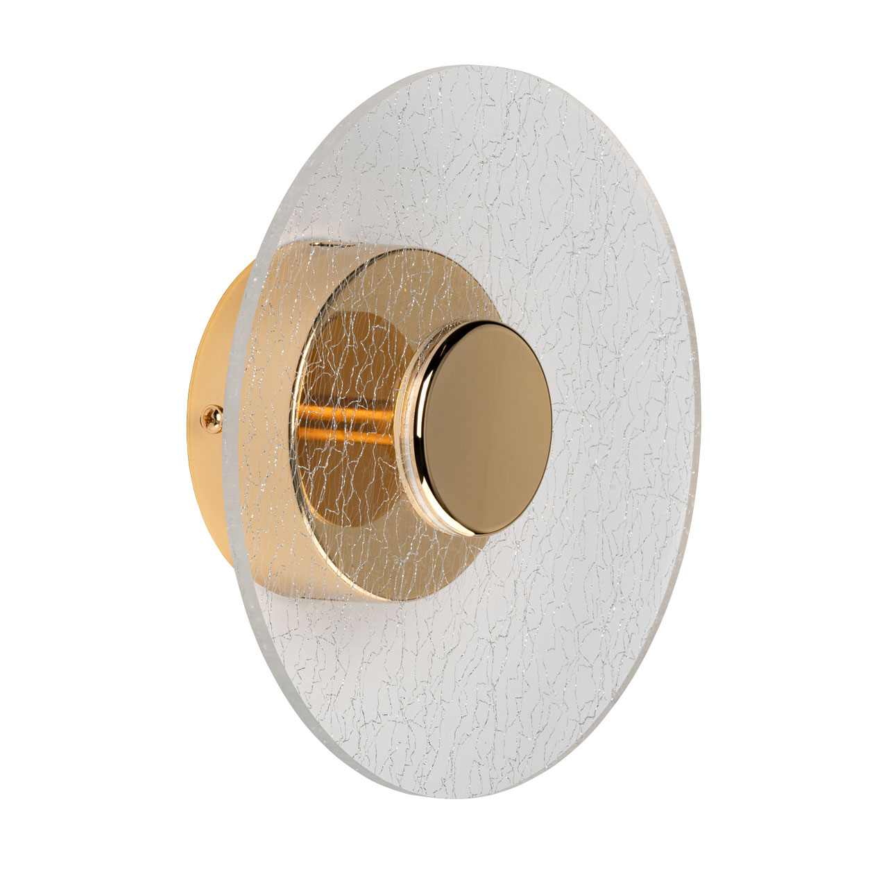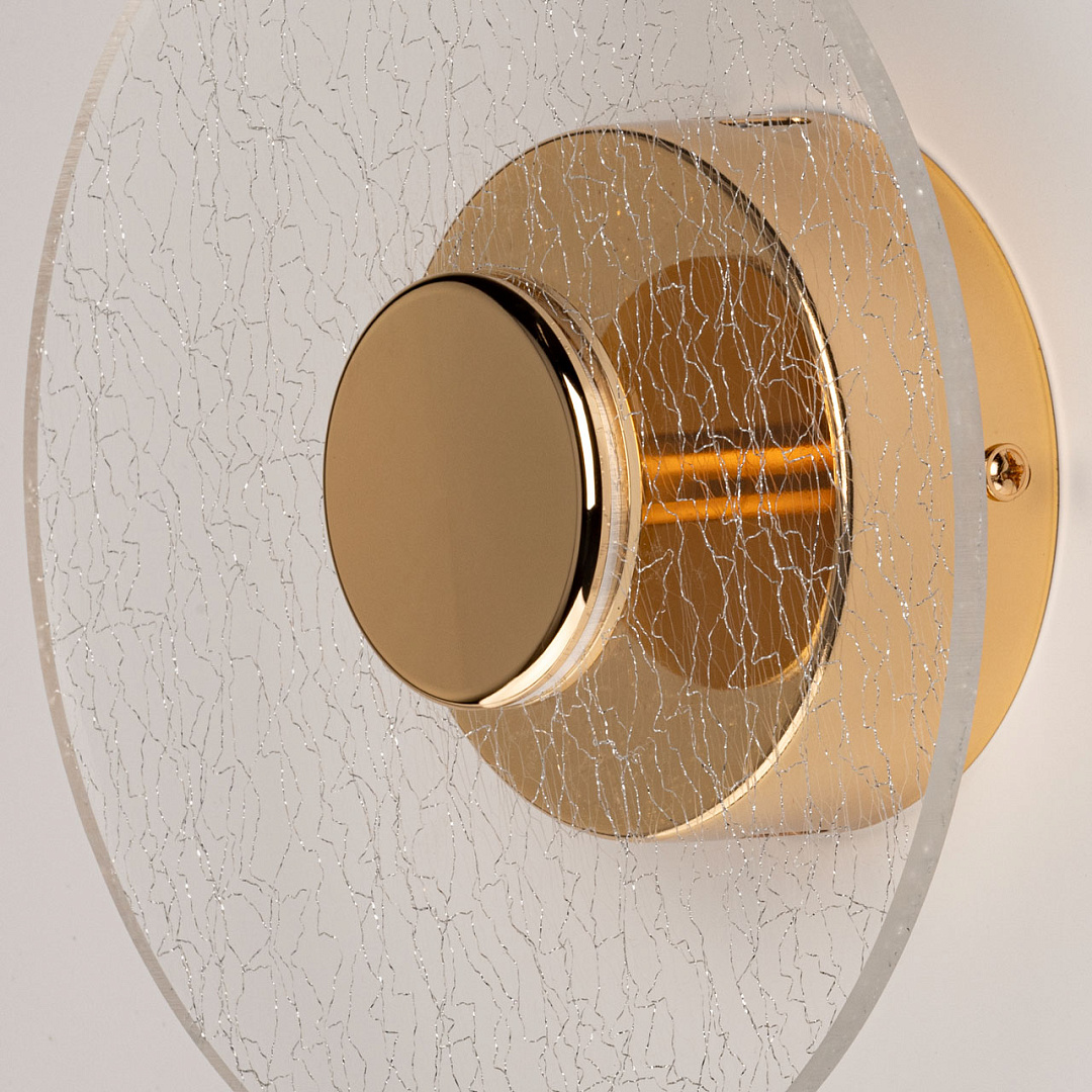 Современное настенное бра в золотом цвете универсально подойдет в классический и современный интерьеры. Эффектный плафон из прозрачного акрила с имитацией льдистого стекла плавно рассеивает свет. Многорежимность с изменением цветовой температуры от 3000К до 6500К является элементом светодизайна и позволяет подобрать комфортную температуру света. Качественные светодиоды и корпус из сплава алюминия  обеспечивают яркое освещение и долгий срок службы. Светодиодные источники света экономичны и безопасны.