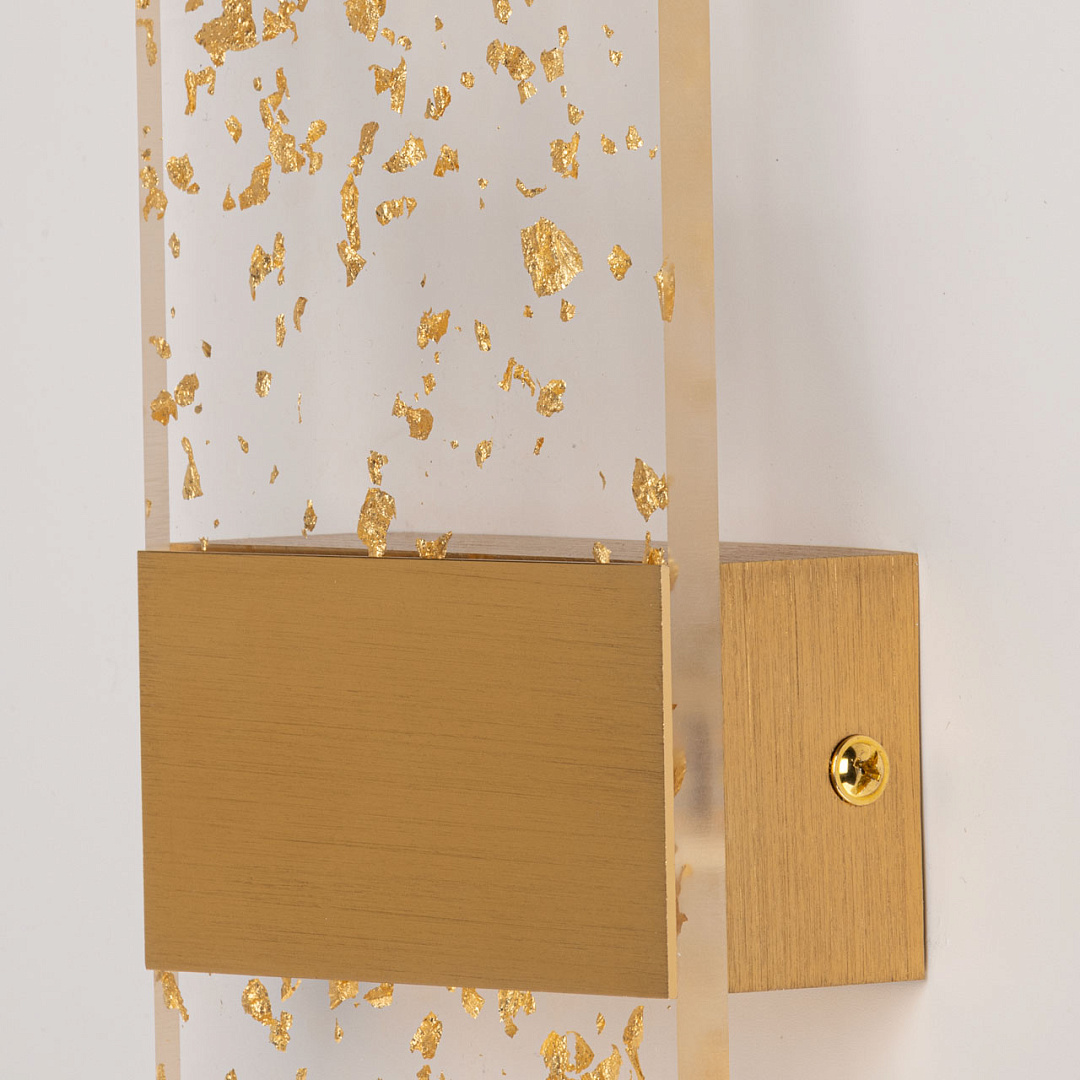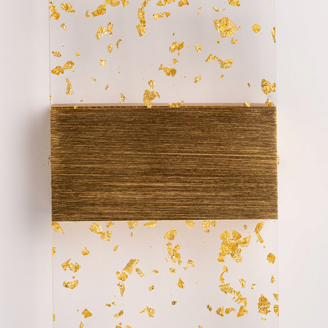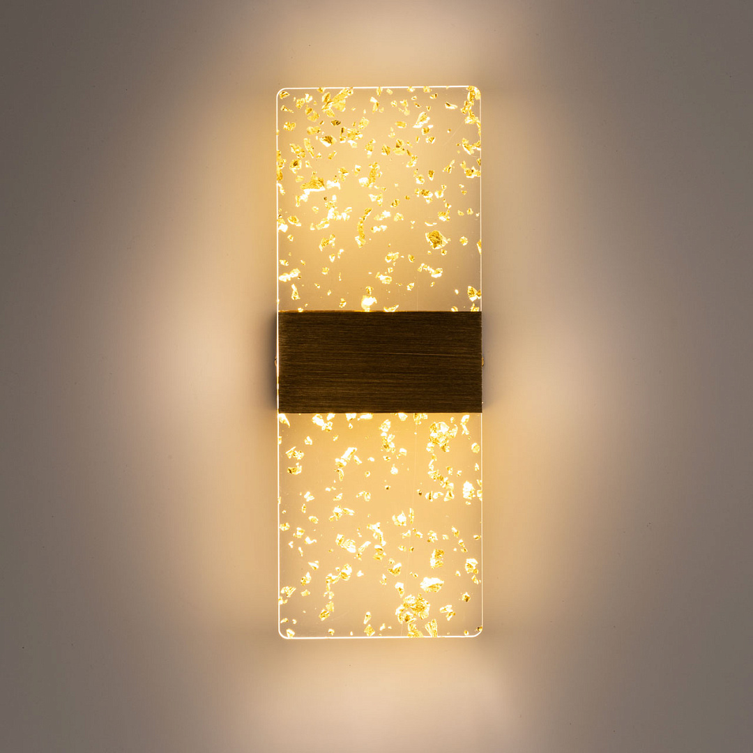 Матовое золото основания гармонично смотрится в интерьере, а декоративные штрихи создают дополнительный эффект. Прозрачный акрил золотые вкрапления мягко рассеивает свет, внося в интерьер комфорт и уют, а золотые вкрапления придают настенному бра гламурности. Многорежимность с изменением цветовой температуры от 3000К до 6500К является элементом светодизайна и позволяет подобрать комфортную температуру света. Качественные светодиоды и корпус из сплава алюминия  обеспечивают яркое освещение и долгий срок службы. Таким образом, настенное бра сочетает в себе элегантность и функциональность. Светодиодные источники света экономичны и безопасны.