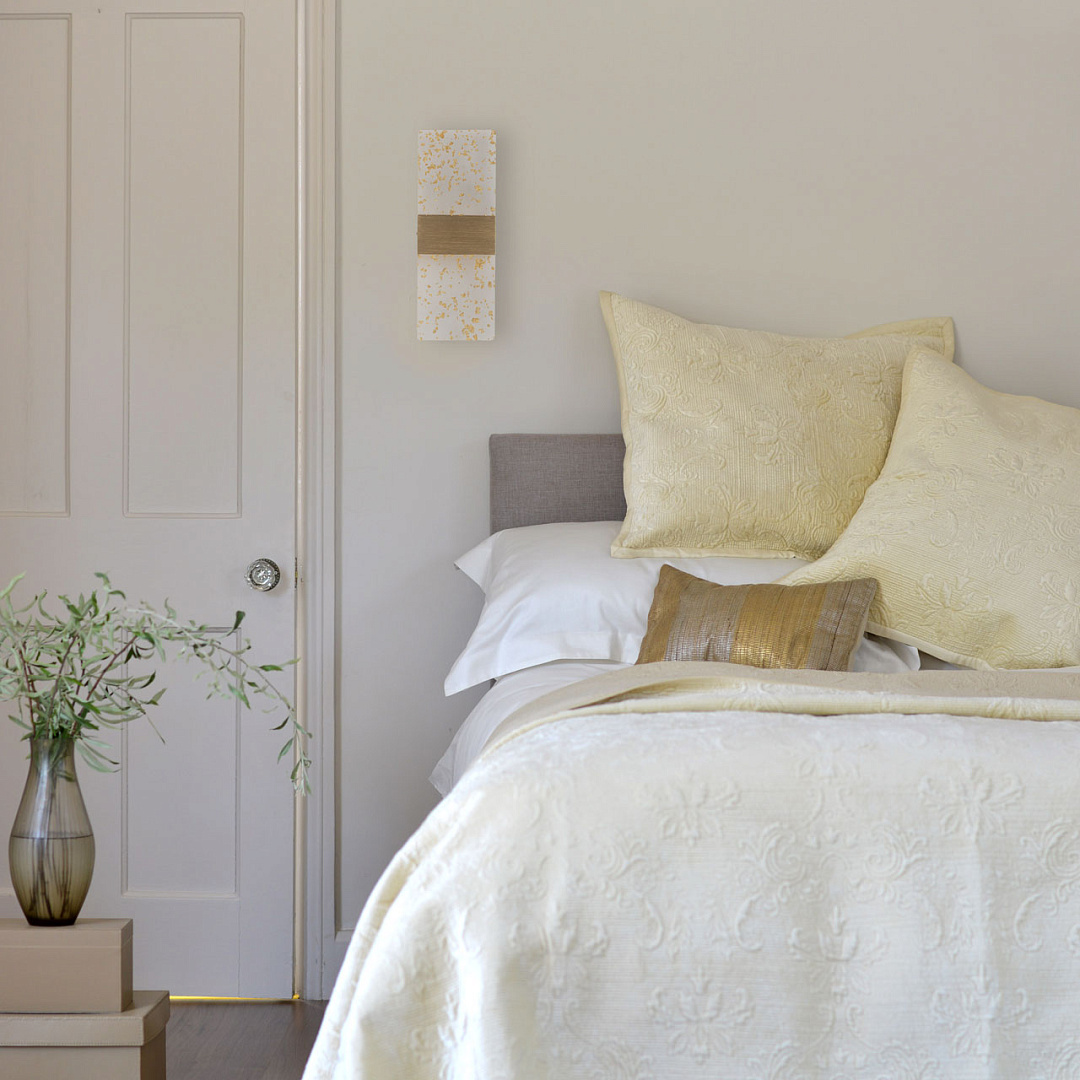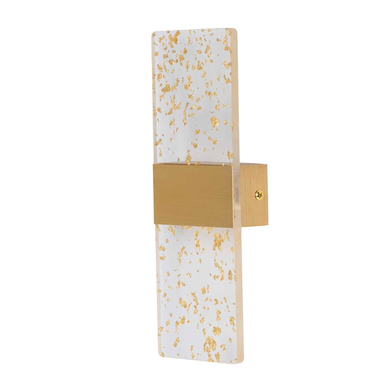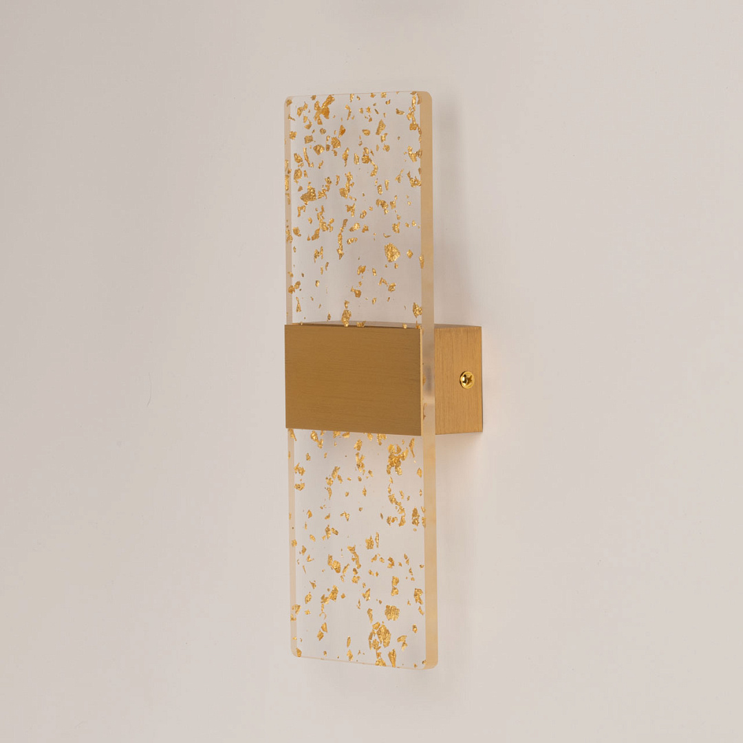 Матовое золото основания гармонично смотрится в интерьере, а декоративные штрихи создают дополнительный эффект. Прозрачный акрил золотые вкрапления мягко рассеивает свет, внося в интерьер комфорт и уют, а золотые вкрапления придают настенному бра гламурности. Многорежимность с изменением цветовой температуры от 3000К до 6500К является элементом светодизайна и позволяет подобрать комфортную температуру света. Качественные светодиоды и корпус из сплава алюминия  обеспечивают яркое освещение и долгий срок службы. Таким образом, настенное бра сочетает в себе элегантность и функциональность. Светодиодные источники света экономичны и безопасны.