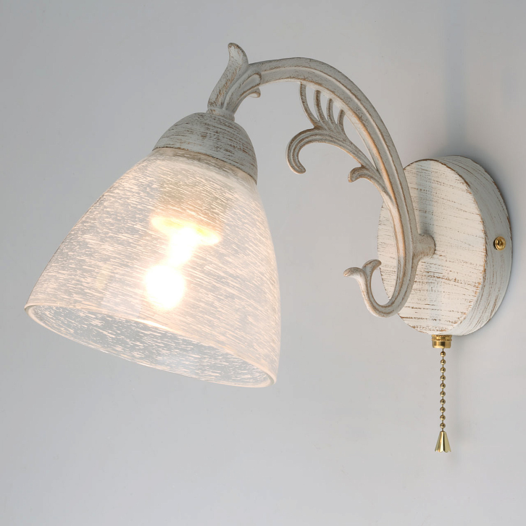 Настенное вертикальное бра вниз создает мягкое местное освещениеБелый цвет основания с патинированием в цвет золота прекрасно подойдет в классический интерьерБра с встроенным выключателем удобно в эксплуатации
