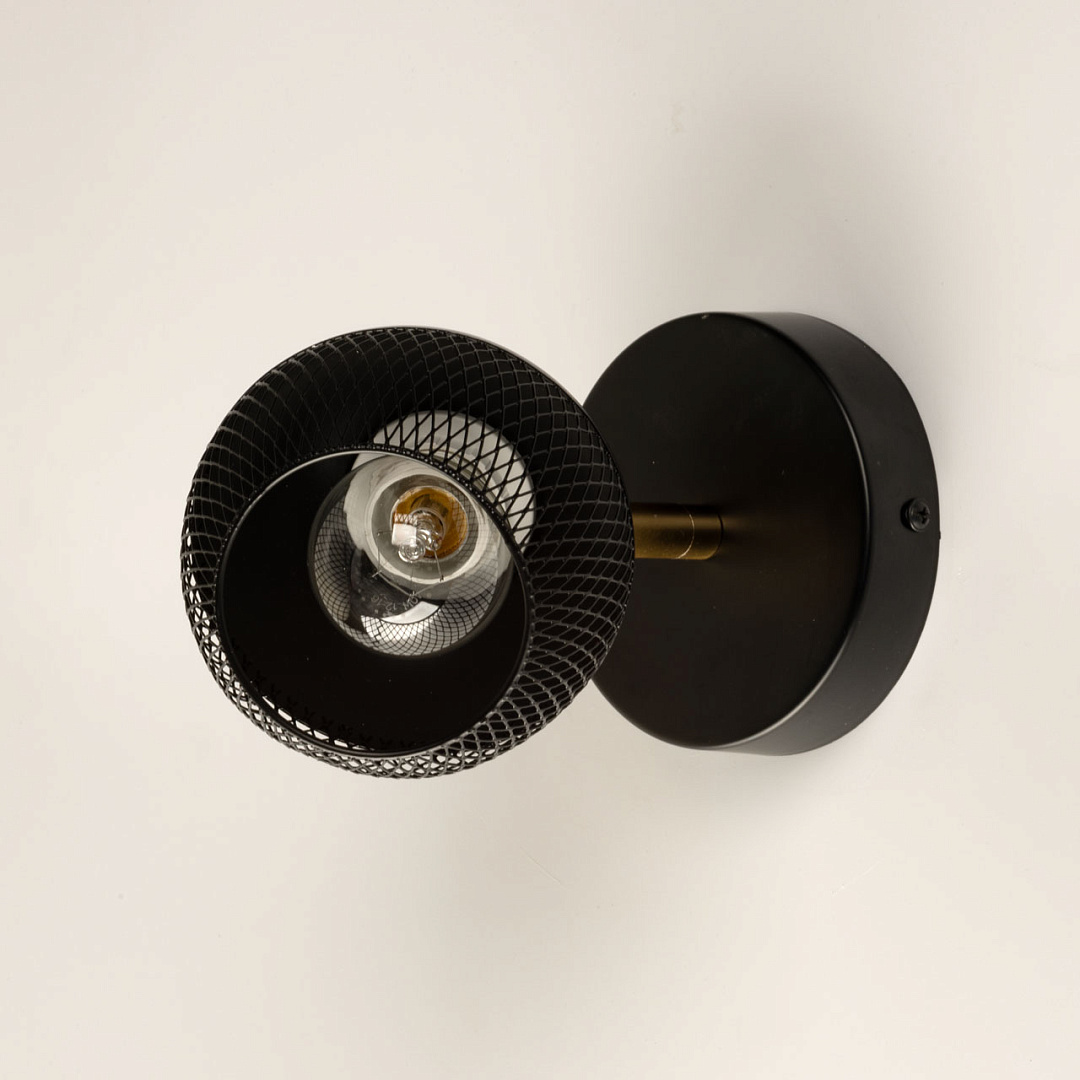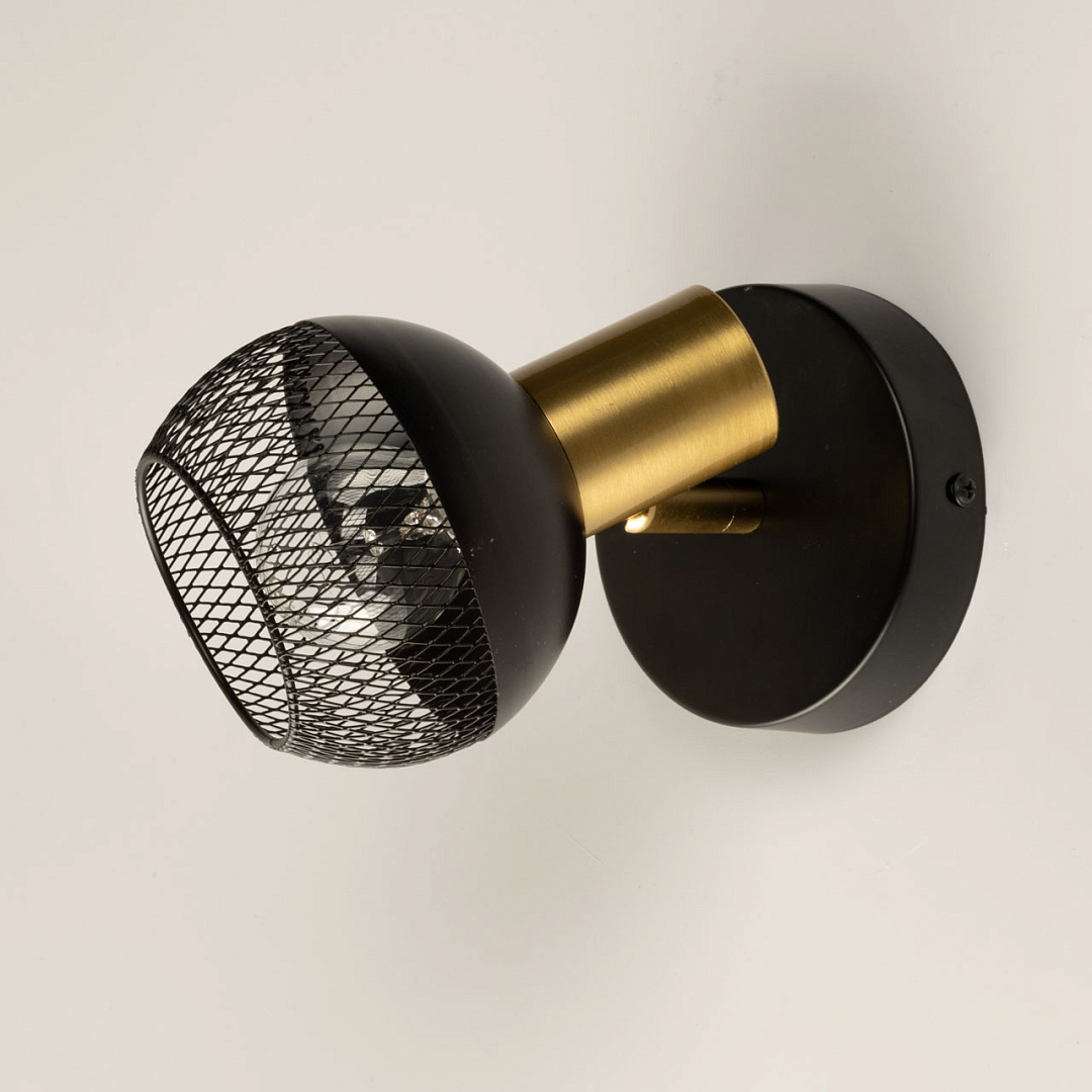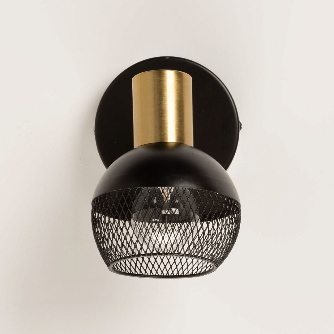 Контрастное сочетание черного цвета и цвета латуни делает настенное бра ярким акцентом в интерьере. Сетчатый узор плафона формирует эффектный световой рисунок. Поворотный плафон с креплением на шарнире позволяет направлять световой поток в нужную сторону, что создает комфортное освещение. Заменяемый источник света удобен в эксплуатации.