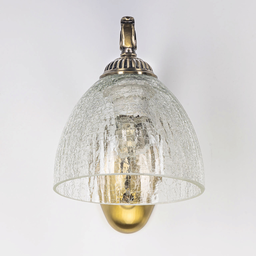 Актуальный цвет античной бронзы.Классический дизайн в дворцовом стиле.Стеклянный кракелированный плафон вниз создает красивый свет.Заменяемый источник света удобен в эксплуатации.